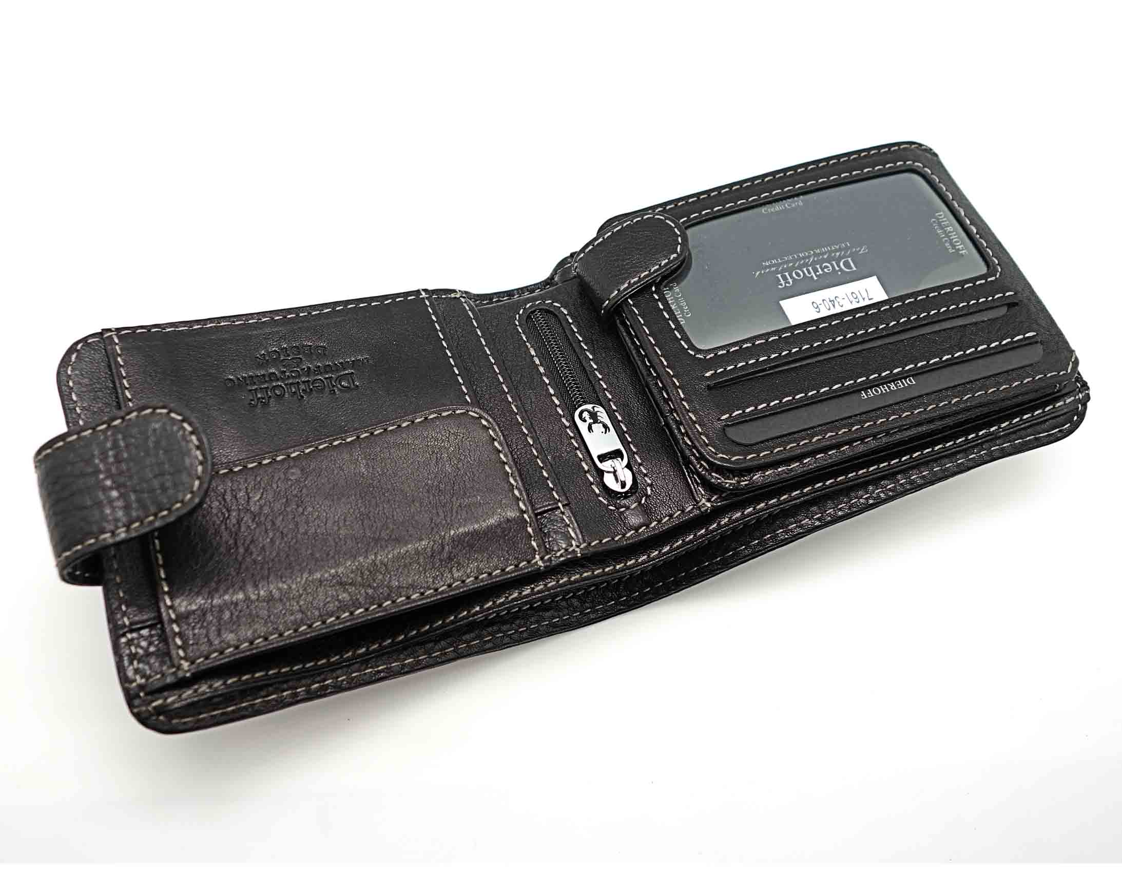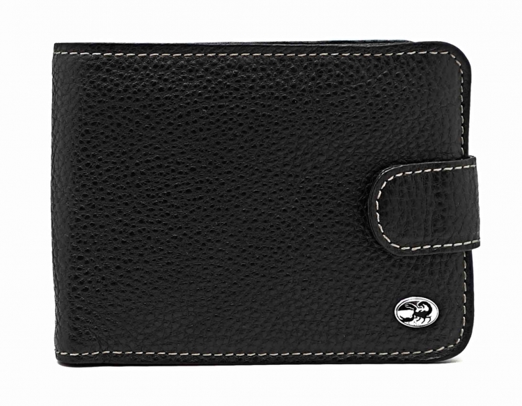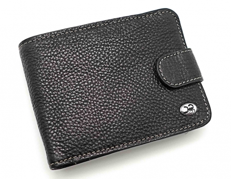 Размер 12,5 х 9,5 см. Закрывается на хлястик с кнопкой. Внутри: три отделения для купюр (одно на молнии), центральный кармашек на молнии, три боковых кармана, семь кармашков для пластиковых карт, три прозрачных окошка, отделение для монет, закрывающееся клапаном на кнопке.