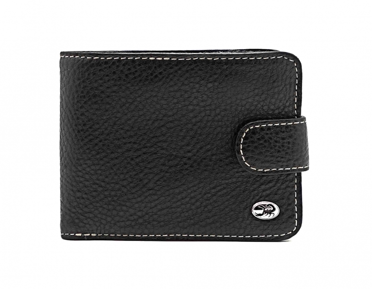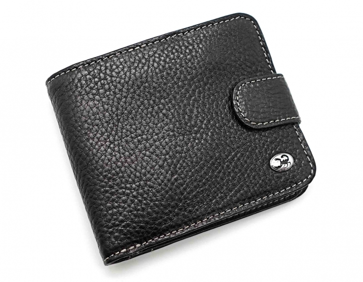Размер 11,5 х 9,5 см. Закрывается на хлястик с кнопкой. Внутри: три отделения для купюр, одно из которых на молнии, четыре боковых кармана, семь кармашков для пластиковых карт, два прозрачных окошка, отделение для монет, закрывающееся клапаном на кнопке.