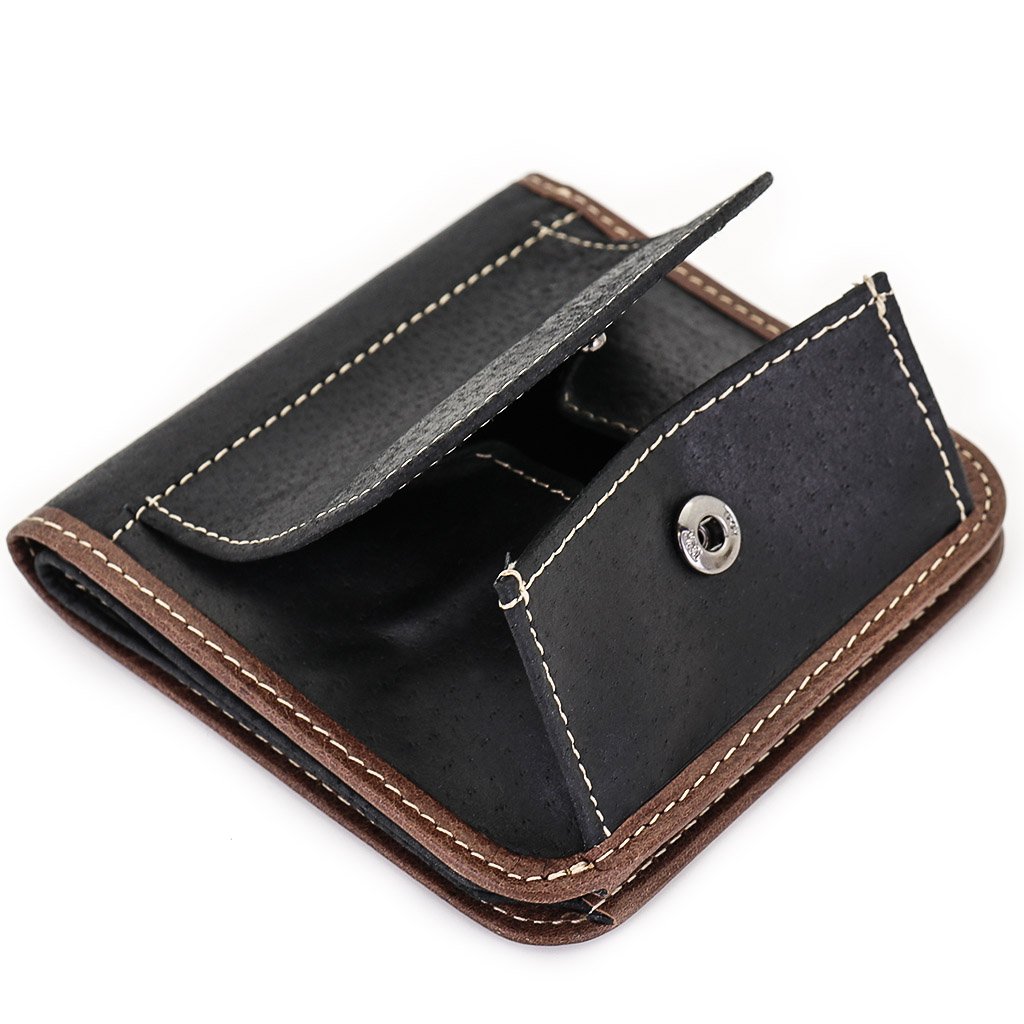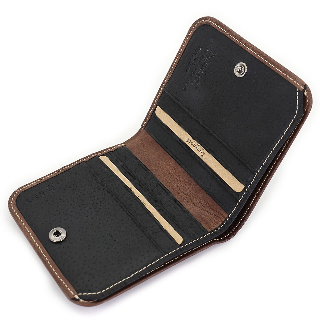 Размер 9,5 х 9,5 см. Закрывается на кнопку. Имеет два отделения для купюр и восемь кармашков для пластиковых карт. Снаружи отделение для монет, закрывающееся клапаном с кнопкой.