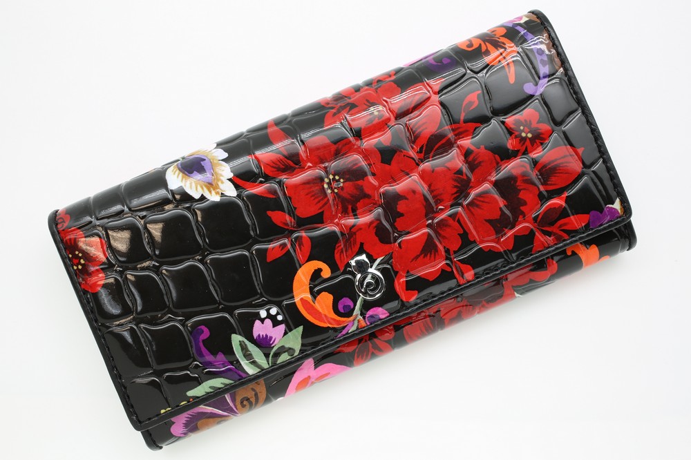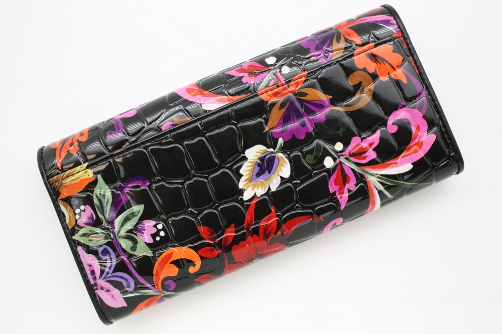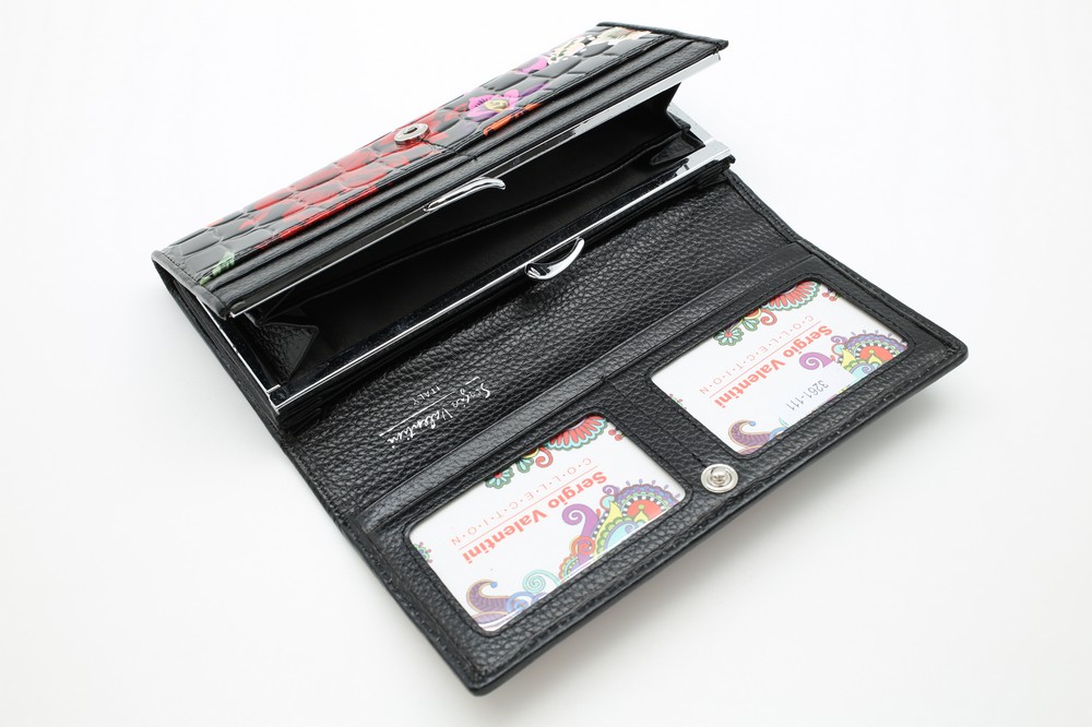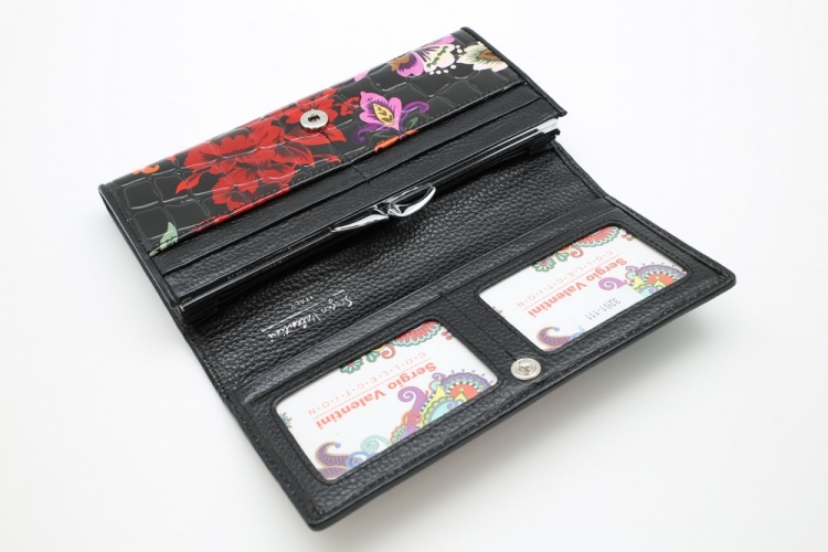 Размер 18,5 х 9.5 см. Закрывается на кнопку. Внутри - три отделения и карман для купюр, два отделения для монет под рамочным замком, карман на молнии, 7 кармашков для пластиковых карт, два прозрачных окошка, один продольный карман на створке. Снаружи, на оборотной стороне - карман без застёжки.