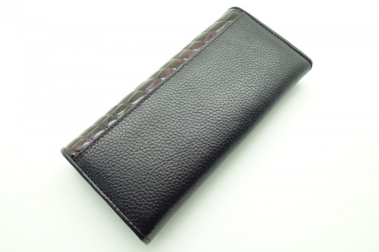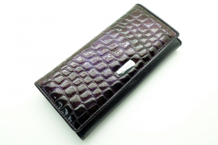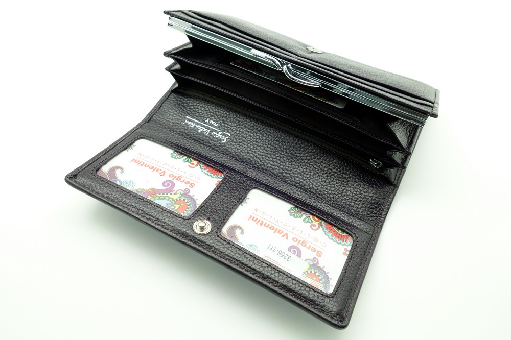 Размер 18,5 х 9.5 см. Закрывается на кнопку. Внутри - три отделения и карман для купюр, два отделения для монет под рамочным замком, карман на молнии, 7 кармашков для пластиковых карт, два прозрачных окошка, один продольный карман на створке. Снаружи, на оборотной стороне - карман без застёжки.