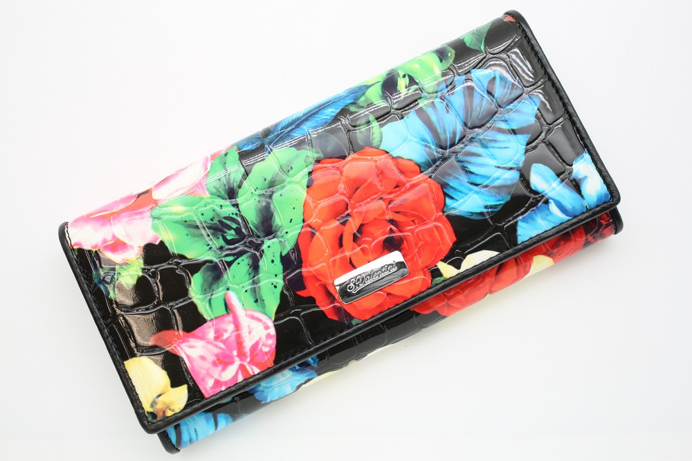 Размер 18,5 х 9.5 см. Закрывается на кнопку. Внутри - три отделения и карман для купюр, два отделения для монет под рамочным замком, карман на молнии, 7 кармашков для пластиковых карт, два прозрачных окошка, один продольный карман на створке. Снаружи, на оборотной стороне - карман без застёжки.