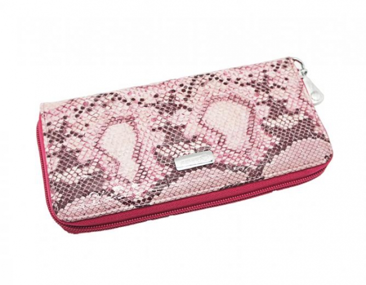 Размер 19,5х9,5 см.. Закрывается на молнию. Внутри - три отделения для купюр, два потайнвх кармана, отделение для монет на молнии, восемь кармашков для пластиковых карт. Снаружи: на оборотной стороне карман на молнии, в нижней левой части металлическое полукольцо для крепления кожаного ремешка с карабином.