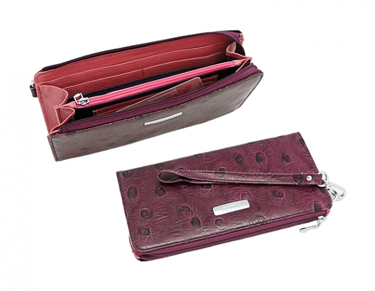 Размер 20 х 10 см.. Закрывается на молнию. Внутри - два отделения и два кармана для купюр, отделение для монет на молнии, 14 кармашков для пластиковых карт. Снаружи: на оборотной стороне карман на молнии, в левой части металлическое полукольцо для крепления кожаного ремешка с карабином.