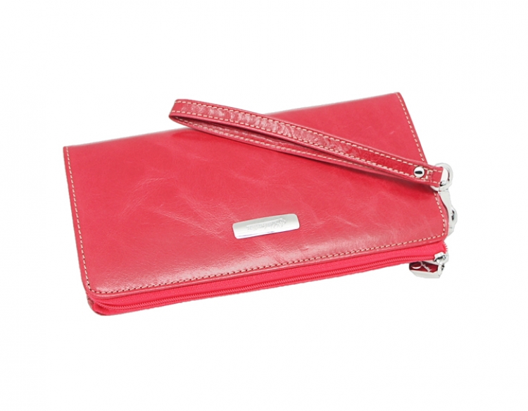 Размер 20 х 10 см.. Закрывается на молнию. Внутри - два отделения и два кармана для купюр, отделение для монет на молнии, 14 кармашков для пластиковых карт. Снаружи: на оборотной стороне карман на молнии, в левой части металлическое полукольцо для крепления кожаного ремешка с карабином.