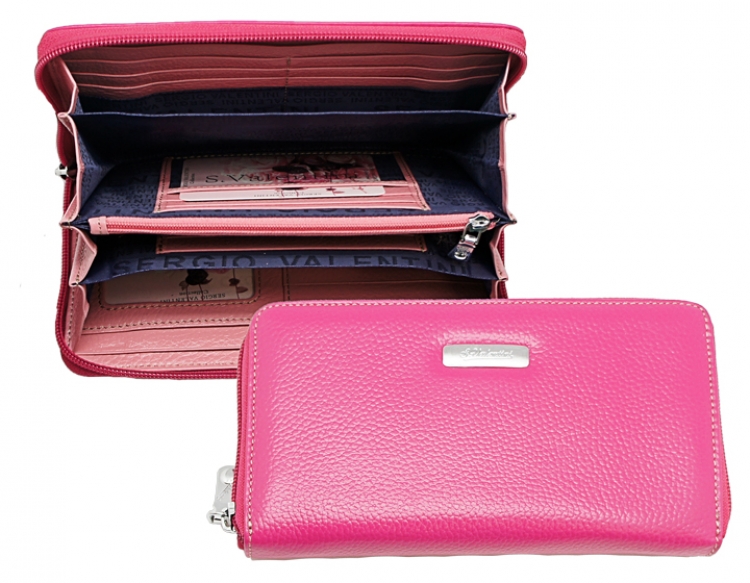 Размер 18,5 х 10 см.. Закрывается на молнию. Внутри - четыре отделения и три кармана для купюр, отделение для монет на молнии, четыре кармашка для пластиковых карт, два кармашка с прозрачными окошками. Снаружи, на оборотной стороне, карман на молнии.