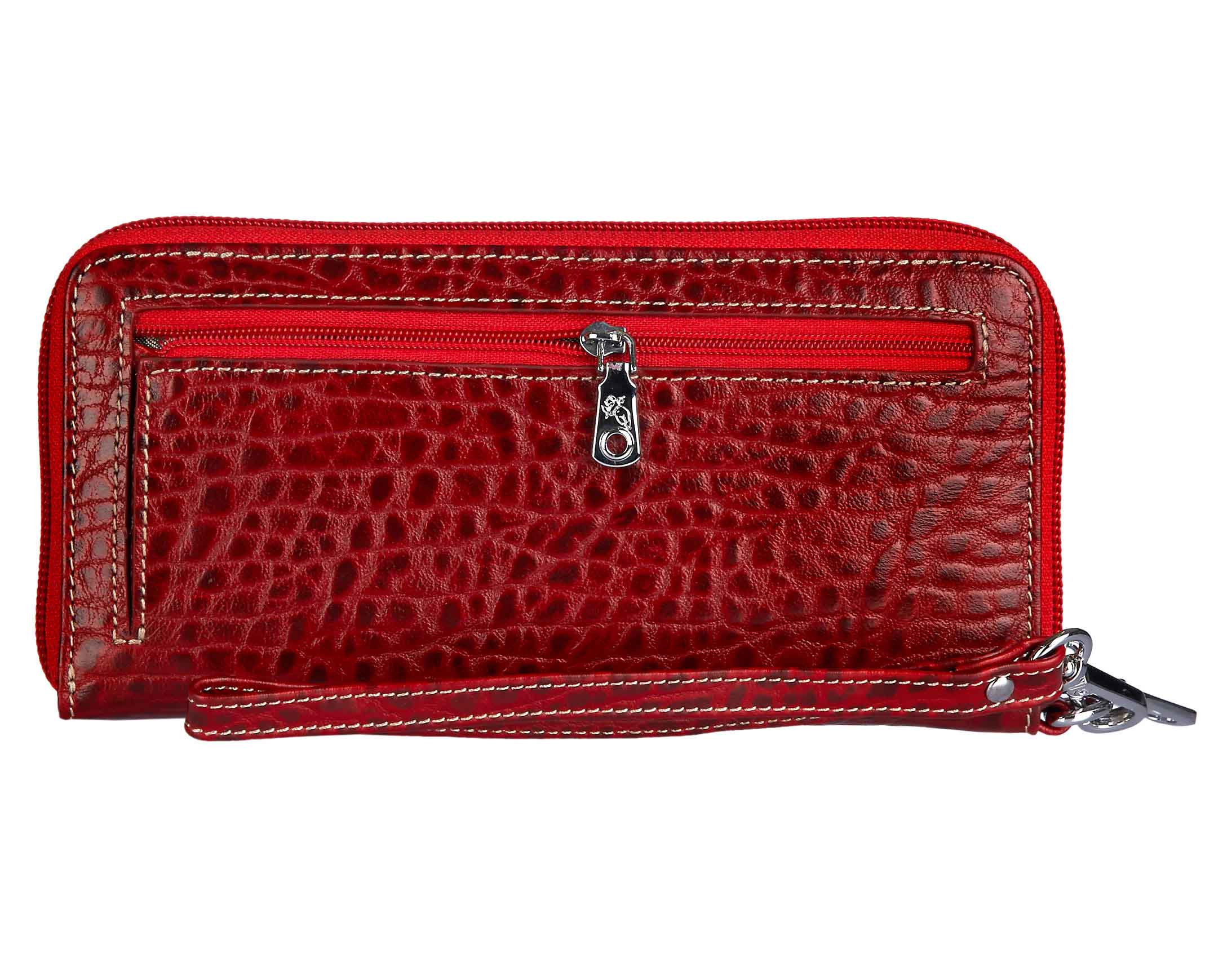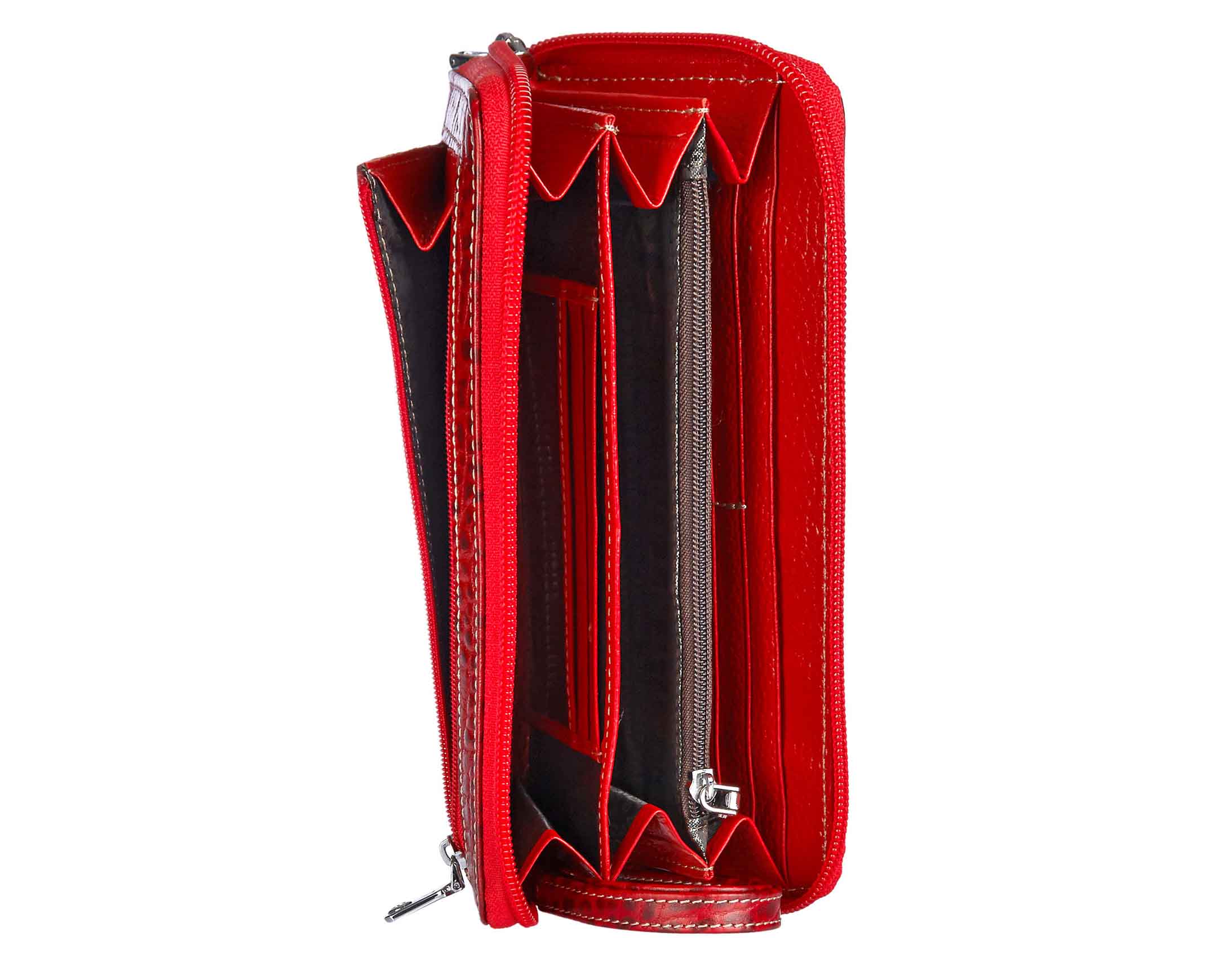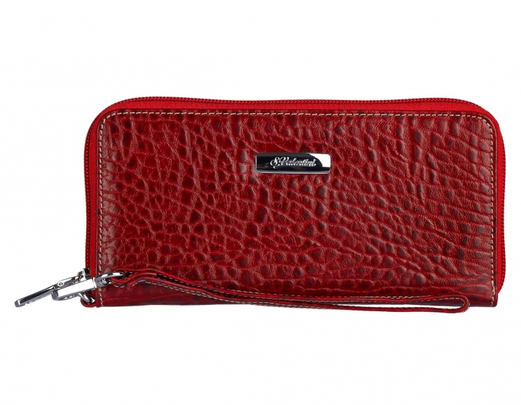 Размер 19,5х9,5 см.. Закрывается на молнию. Внутри - три отделения и два кармана для купюр, отделение для монет на молнии, восемь кармашков для пластиковых карт. Снаружи: на оборотной стороне карман на молнии, в нижней левой части металлическое полукольцо для крепления кожаного ремешка с карабином.