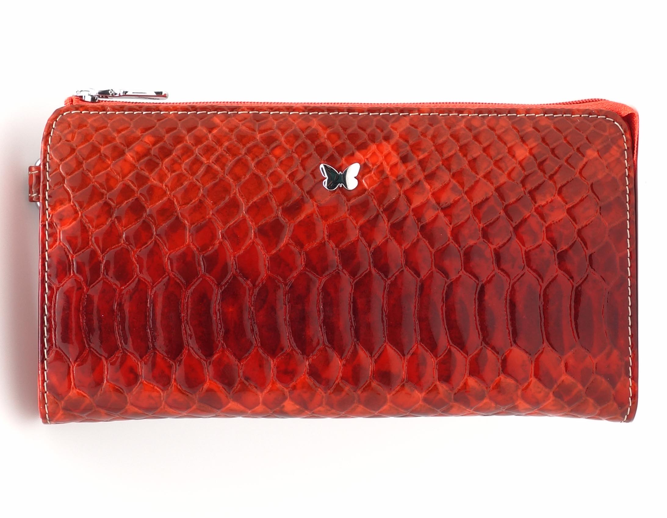 Размер 20 х 10 см.. Закрывается на молнию. Внутри - два отделения и два кармана для купюр, отделение для монет на молнии, 14 кармашков для пластиковых карт. Снаружи: на оборотной стороне карман на молнии, в левой части металлическое полукольцо для крепления кожаного ремешка с карабином.