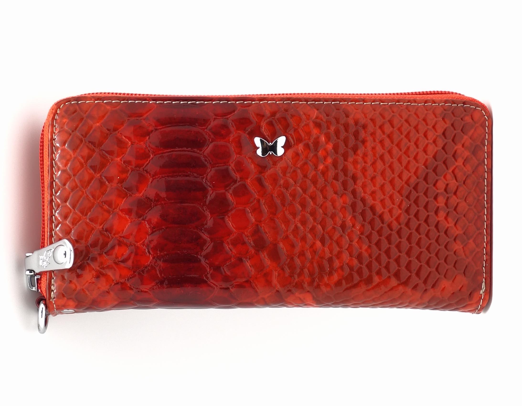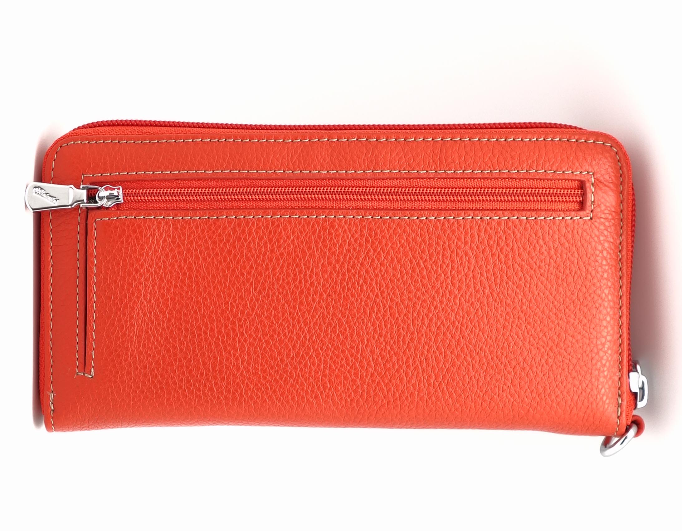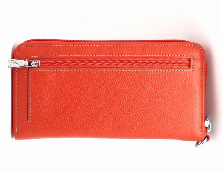 Размер 19,5 х 9,5 см.. Закрывается на молнию. Внутри - три отделения и два кармана для купюр, отделение для монет на молнии, 14 кармашков для пластиковых карт. Снаружи: на оборотной стороне карман на молнии, в нижней левой части металлическое полукольцо для крепления кожаного ремешка с карабином.