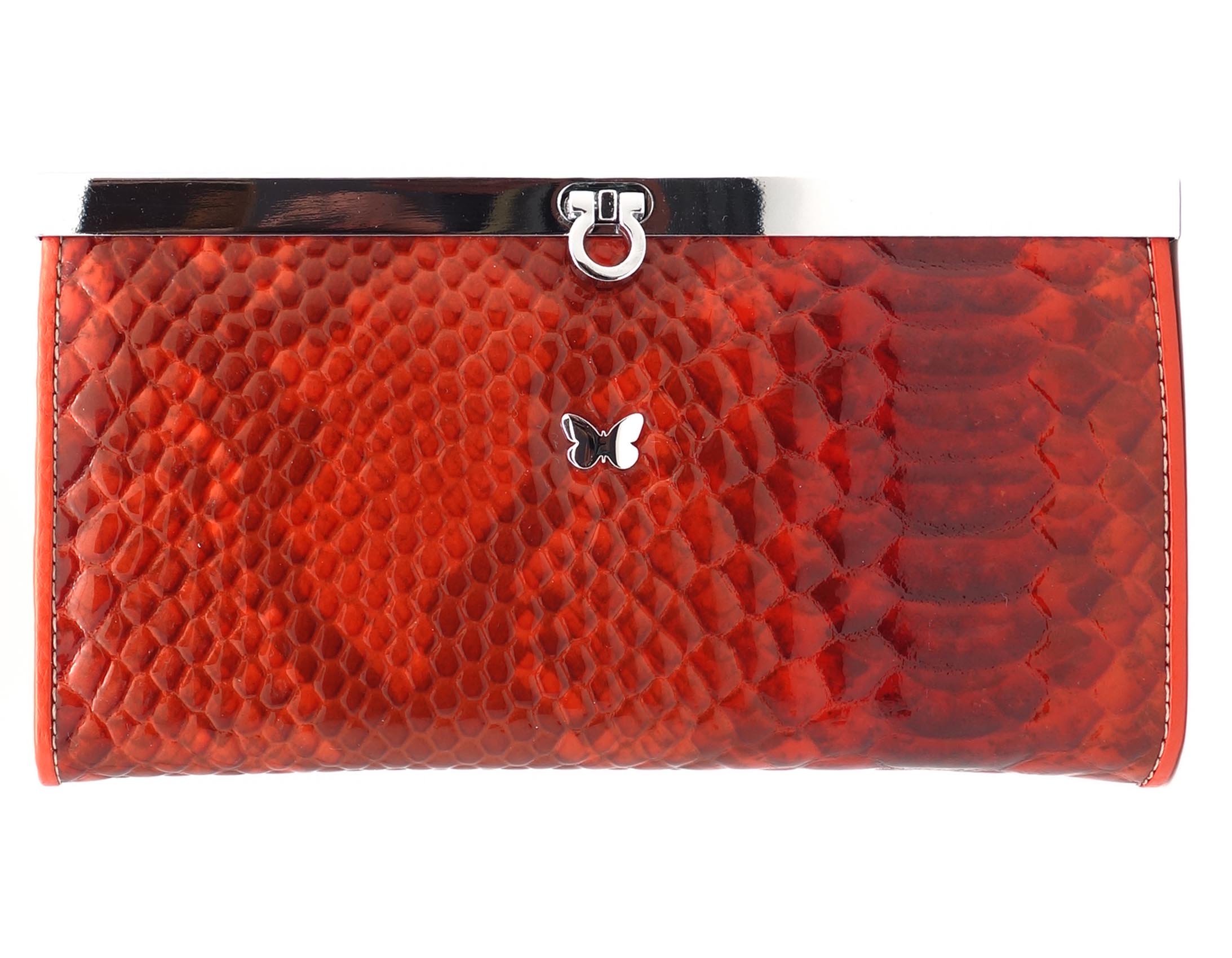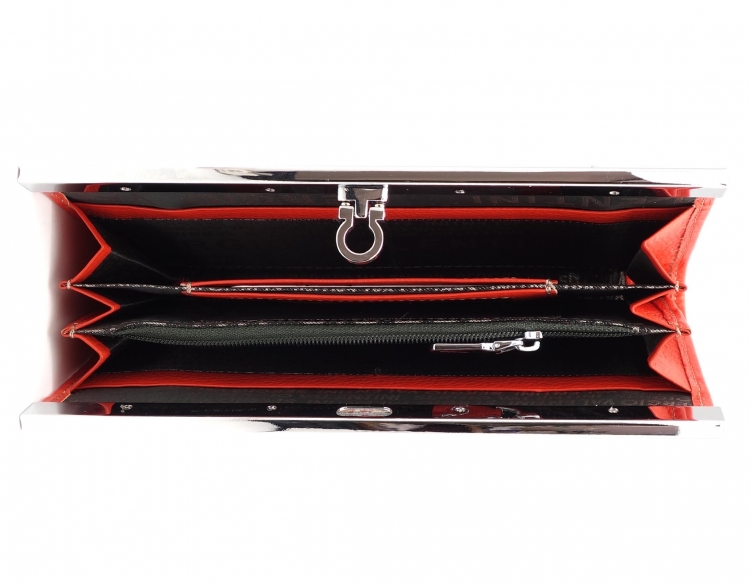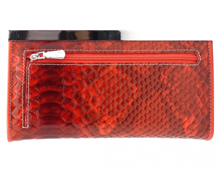 Размер 19 х 10 см. Закрывается на рамочный металлический замок. Внутри: три отделения и два кармана для купюр, отделение на молнии, шесть кармашков для пластиковых карт. Снаружи, на оборотной стороне карман на молнии.
