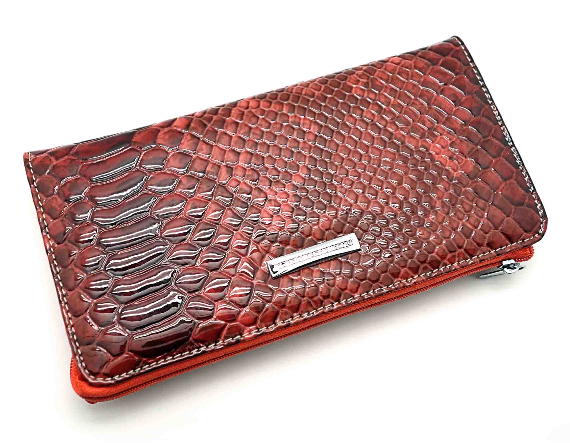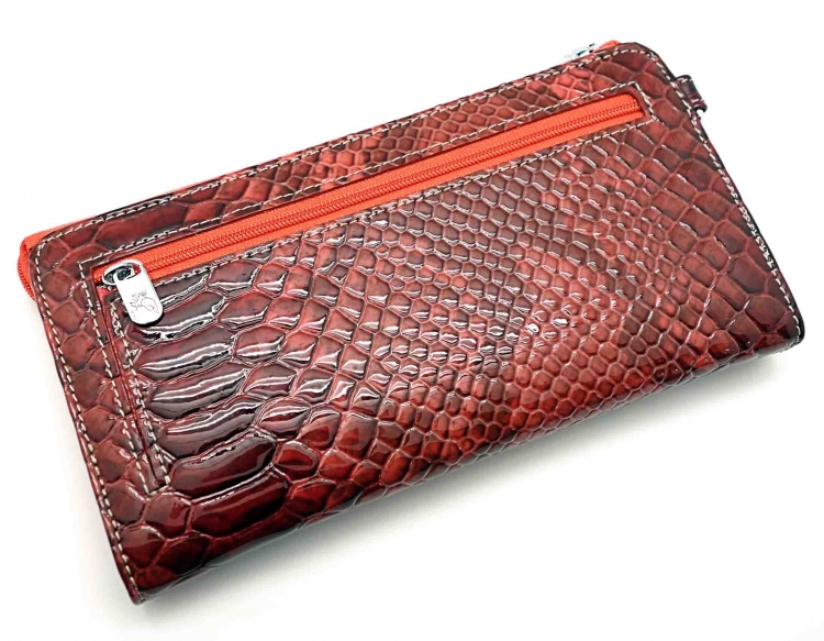 Размер 20 х 10 см.. Закрывается на молнию. Внутри - два отделения и два кармана для купюр, отделение для монет на молнии, 14 кармашков для пластиковых карт. Снаружи: на оборотной стороне карман на молнии, в левой части металлическое полукольцо для крепления кожаного ремешка с карабином.
