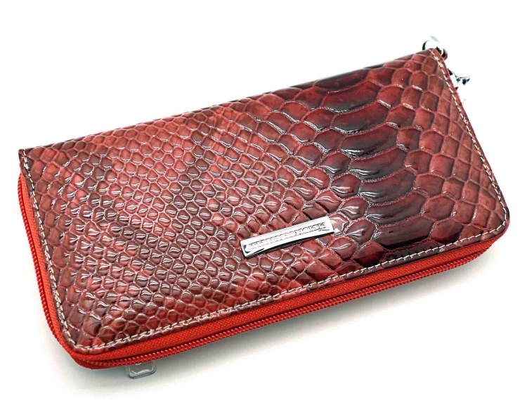Размер 19 х 9,5 см.. Закрывается на молнию. Внутри - три отделения и два кармана для купюр, отделение для монет на молнии, 15 кармашков для пластиковых карт. Снаружи: на оборотной стороне карман на молнии, в нижней левой части металлическое полукольцо для крепления кожаного ремешка с карабином.