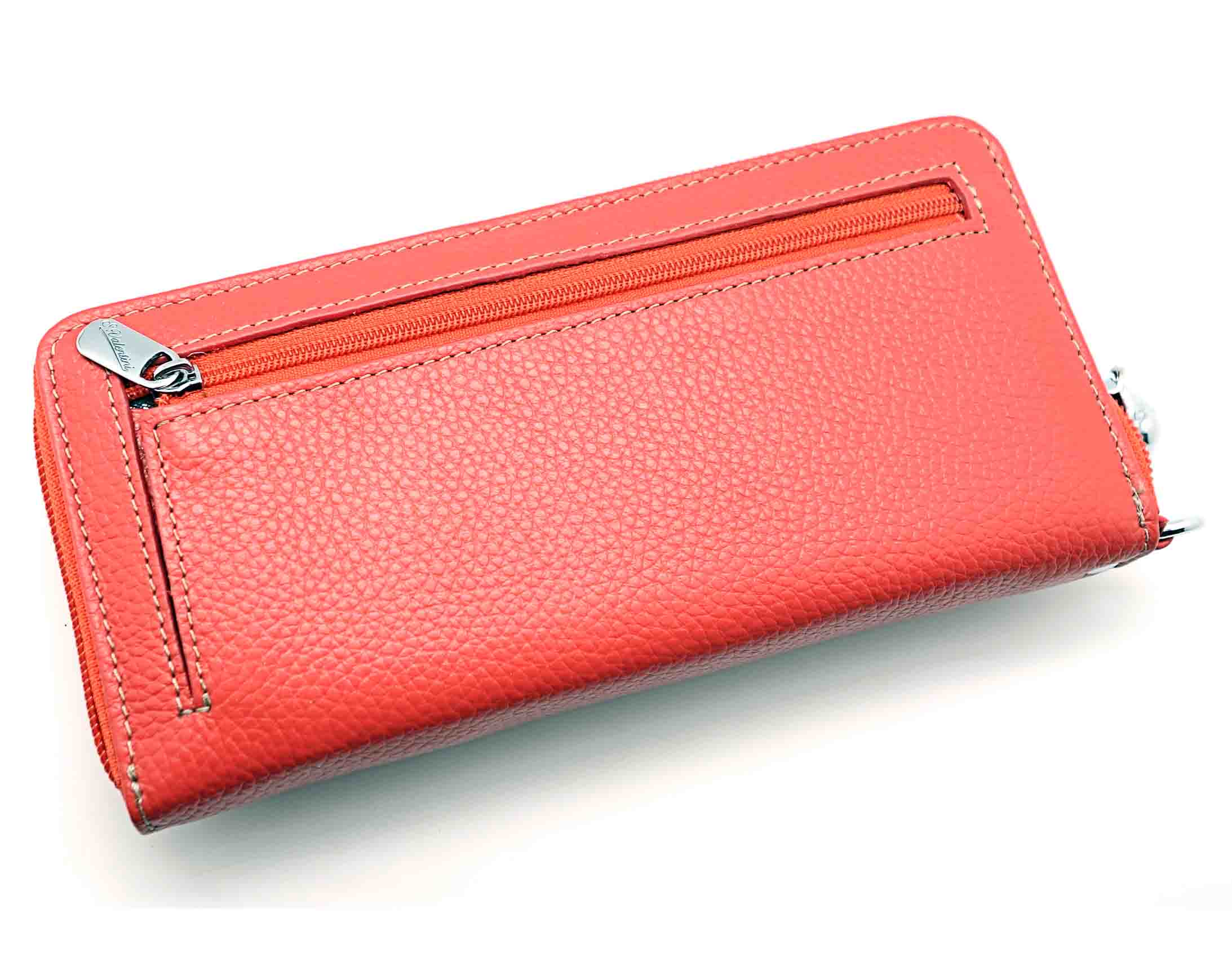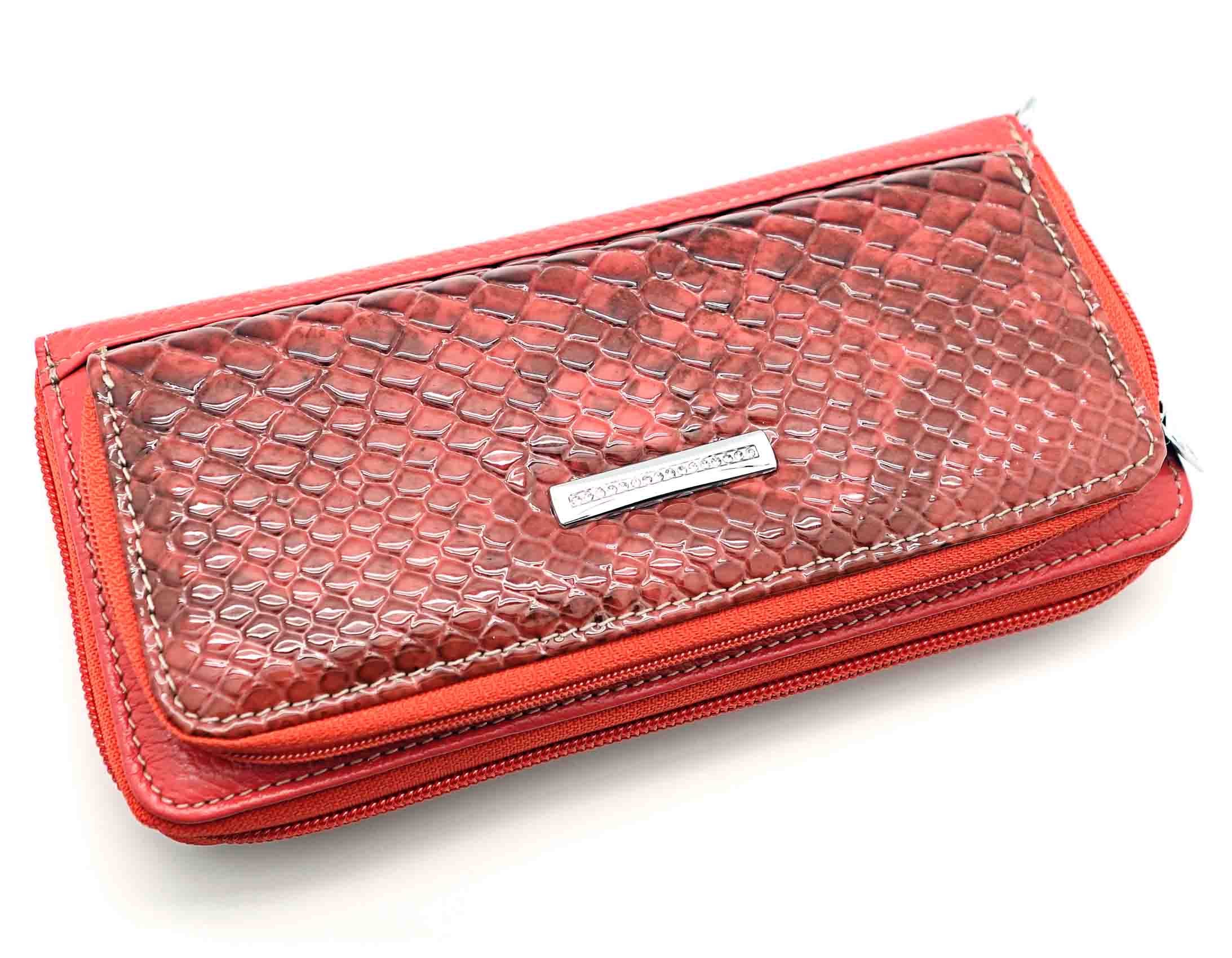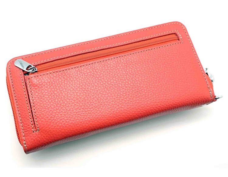 Размер 19,5 х 9,5 х 3,5 см.. Закрывается на молнию. Внутри - три отделения и два кармана для купюр, отделение на молнии, 15 кармашков для пластиковых карт. Снаружи: на лицевой стороне отделение для монет на молнии, на оборотной стороне карман на молнии, в нижней левой части металлическое полукольцо для крепления кожаного ремешка с карабином.