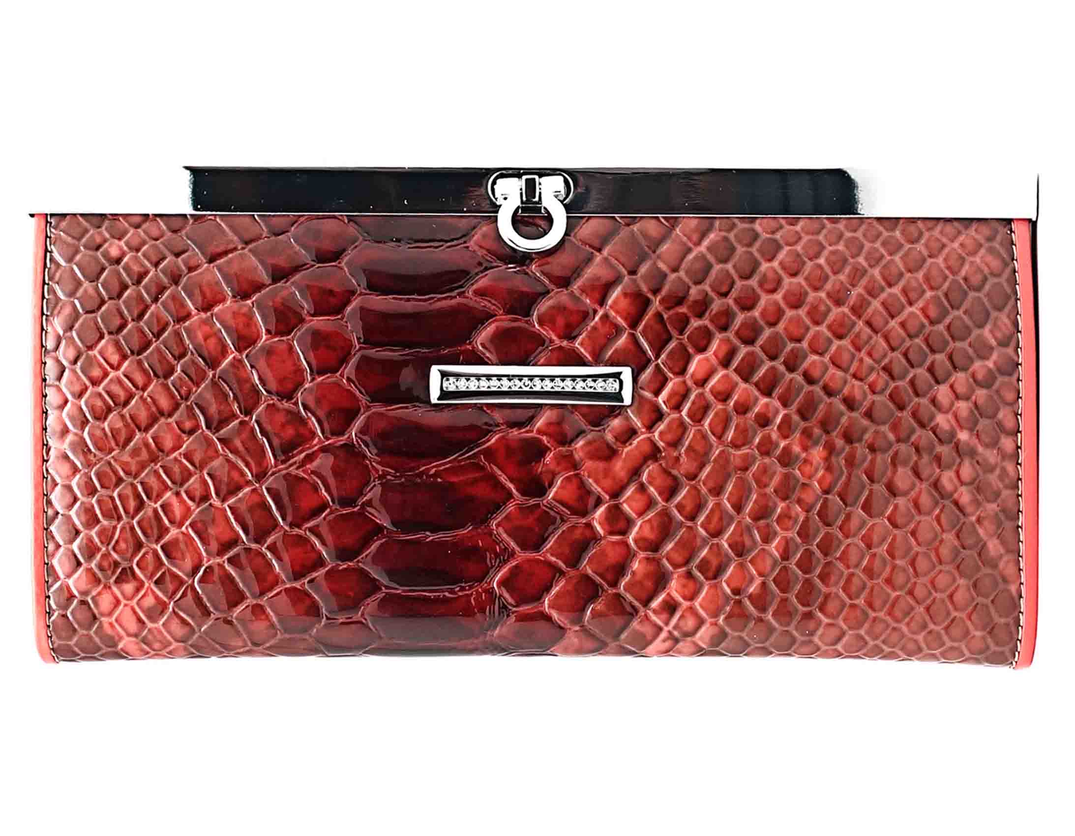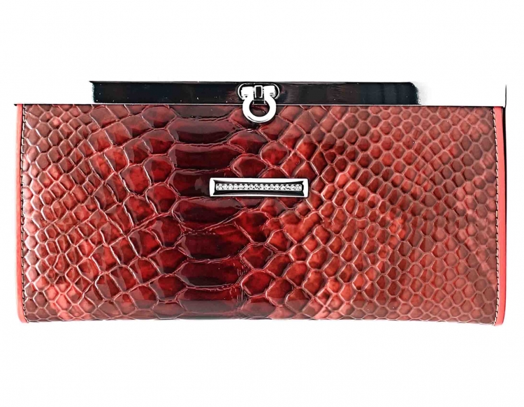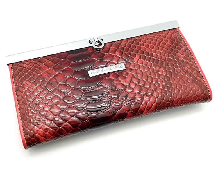 Размер 19 х 10 см. Закрывается на рамочный металлический замок. Внутри: три отделения и два кармана для купюр, отделение на молнии, шесть кармашков для пластиковых карт. Снаружи, на оборотной стороне карман на молнии.