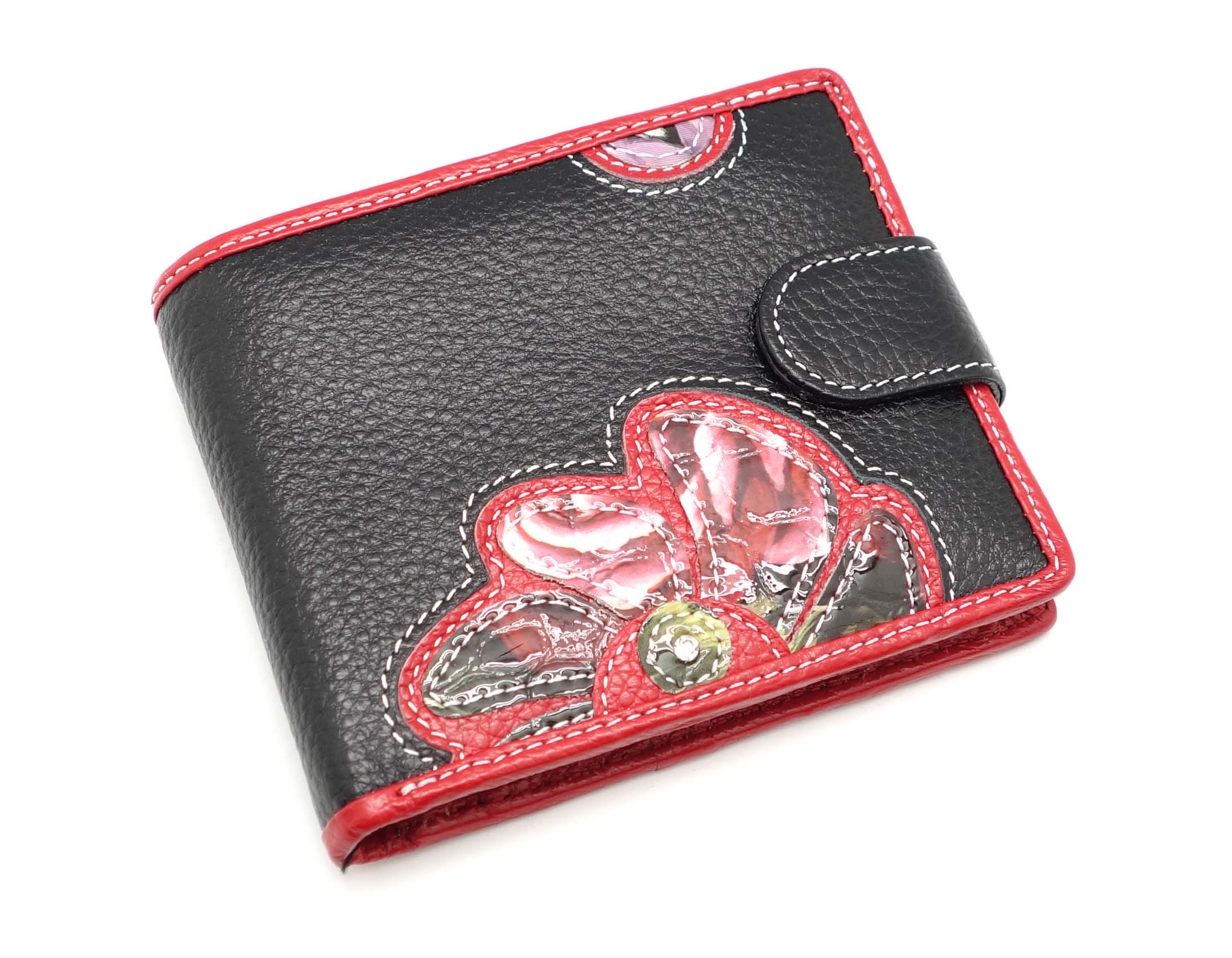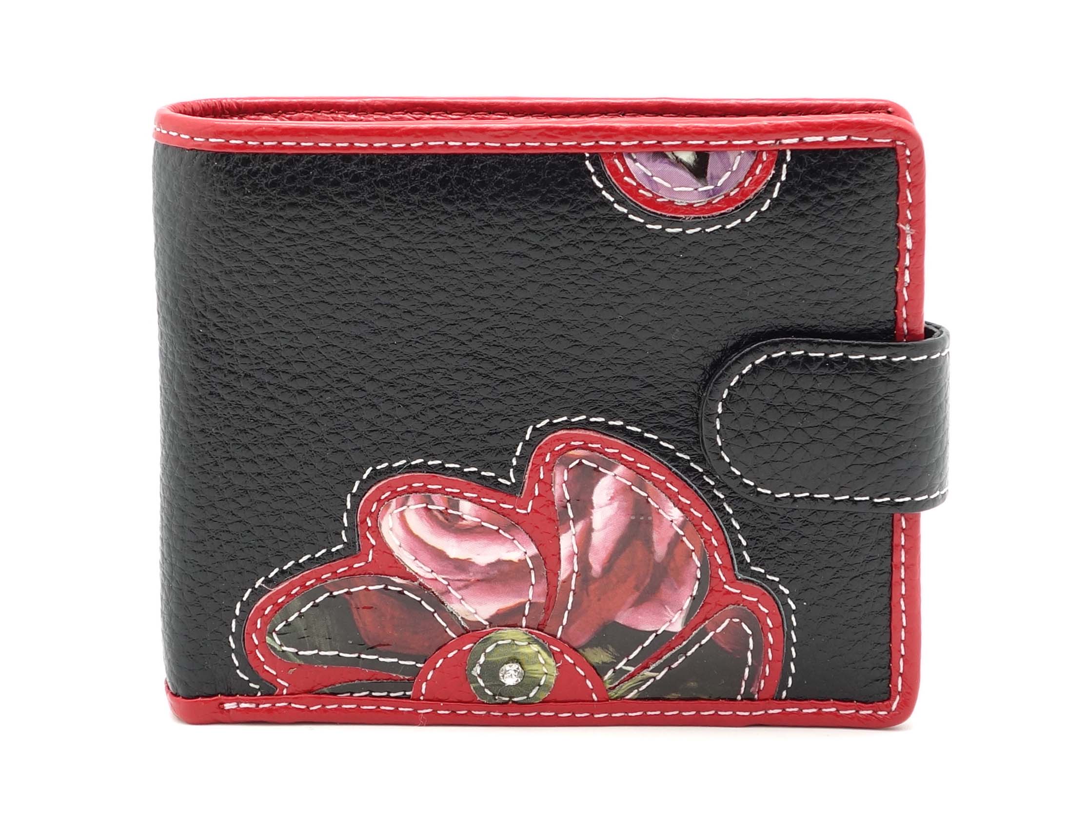 Ограниченная серия аксессуаров, изготовленных из мягкой натуральной кожи и декорированных аппликацией. При производстве этого портмоне использована значительная доля ручного труда. Размер 11,5 х 9,5 см. Закрывается на хлястик с кнопкой. Внутри два открытых отделения для купюр и одно на молнии, семь кармашков для пластиковых карт, два прозрачных окошка на клапане, два боковых кармана и отделение для монет, закрывающееся на на кнопку.