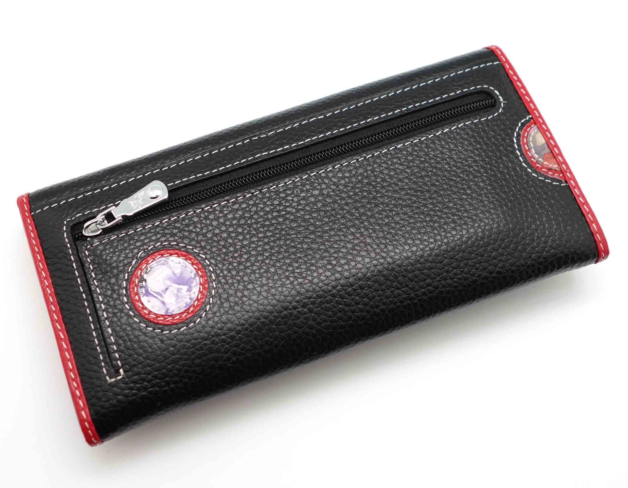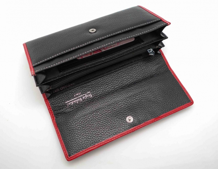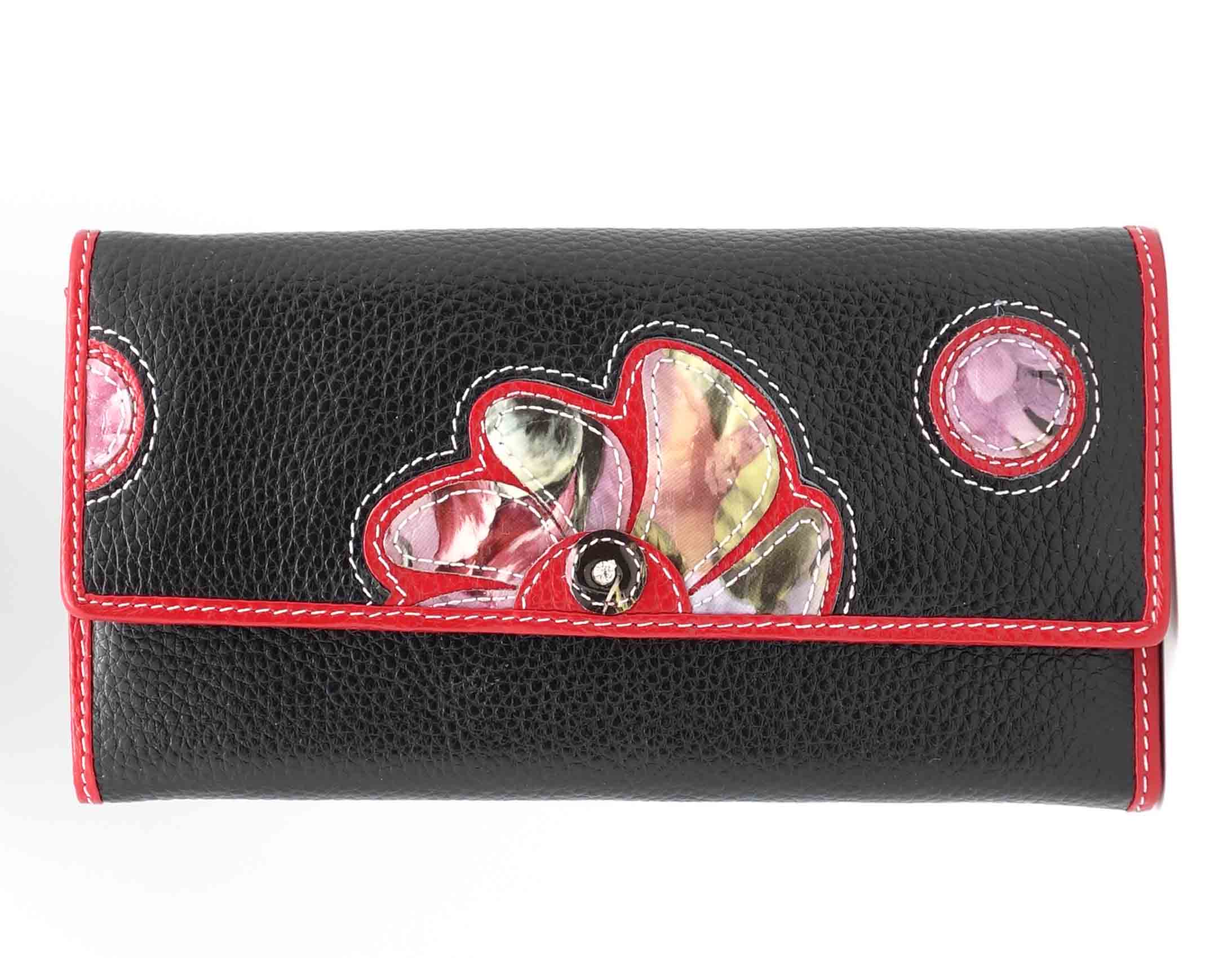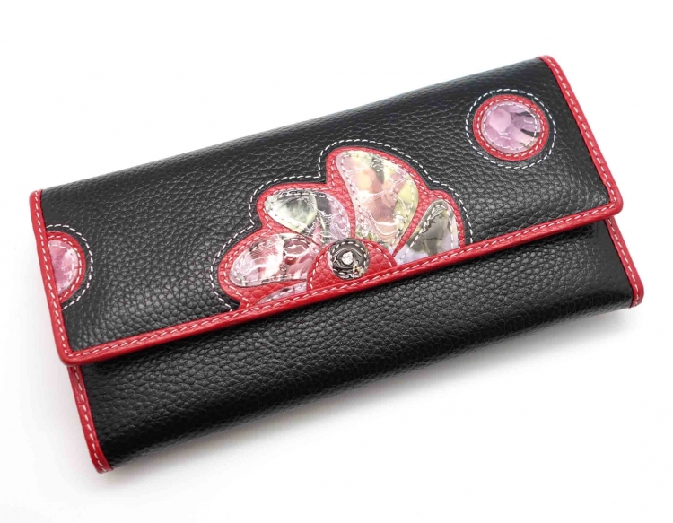 Ограниченная серия аксессуаров, изготовленных из мягкой натуральной кожи и декорированных аппликацией. При производстве этого портмоне использована значительная доля ручного труда. Размер 18,5 х 9,5 см.. Закрывается на кнопку. Внутри - три отделения и два кармана для купюр, девять кармашков для пластиковых карт, отделение на молнии. Снаружи, на оборотной стороне, отделение для монет на молнии.