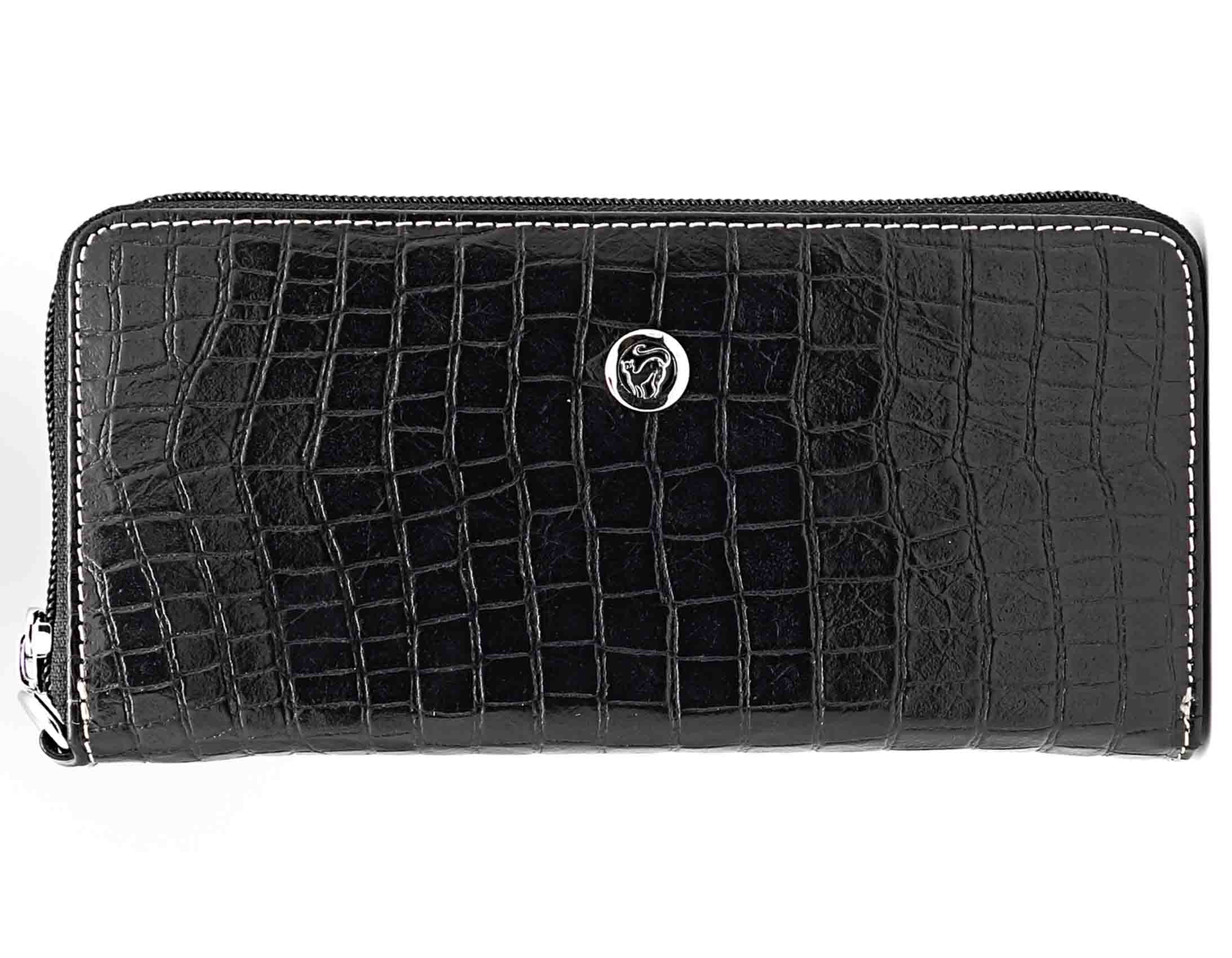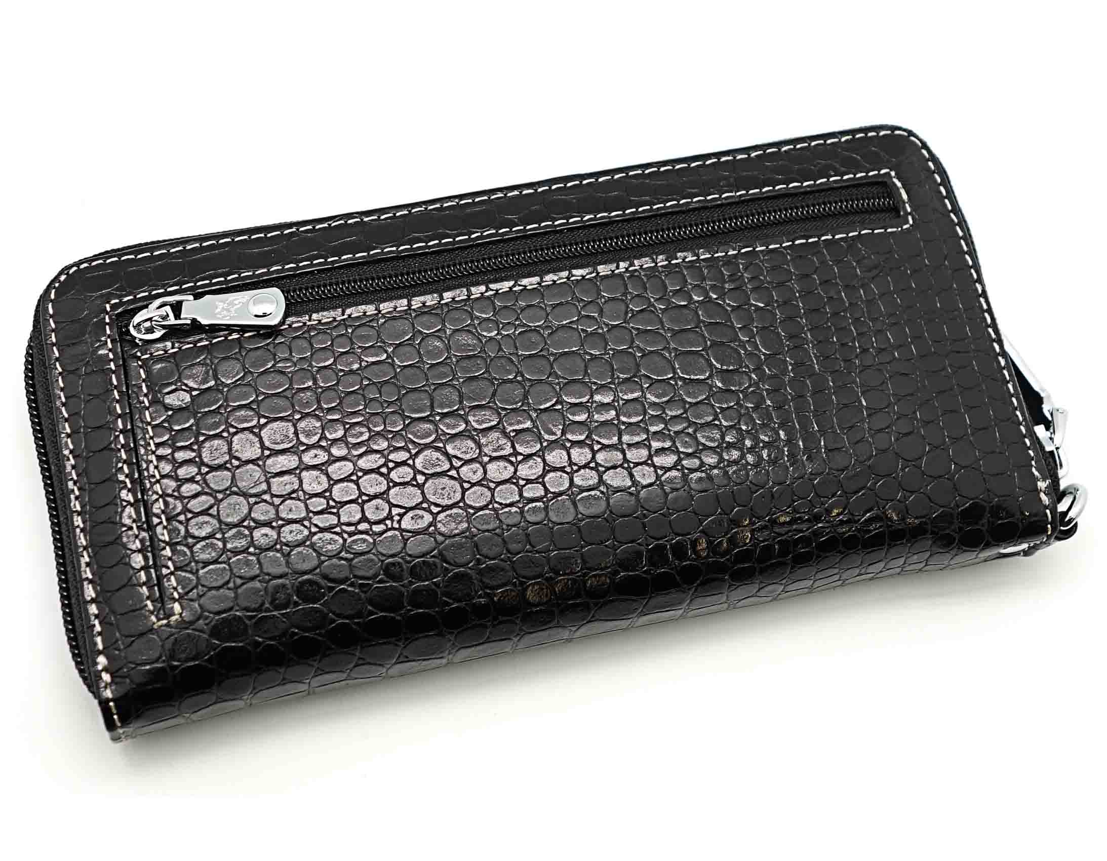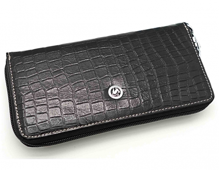 Размер 19 х 9,5 см.. Закрывается на молнию. Внутри - три отделения и два кармана для купюр, отделение для монет на молнии, 15 кармашков для пластиковых карт. Снаружи: на оборотной стороне карман на молнии, в нижней левой части металлическое полукольцо для крепления кожаного ремешка с карабином.