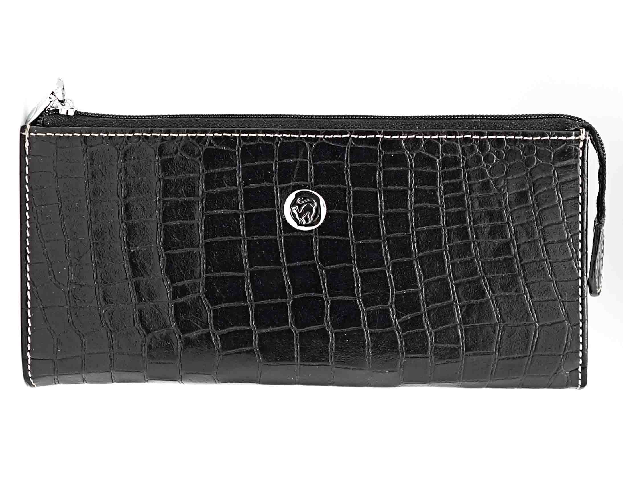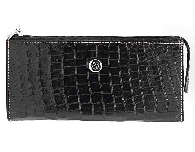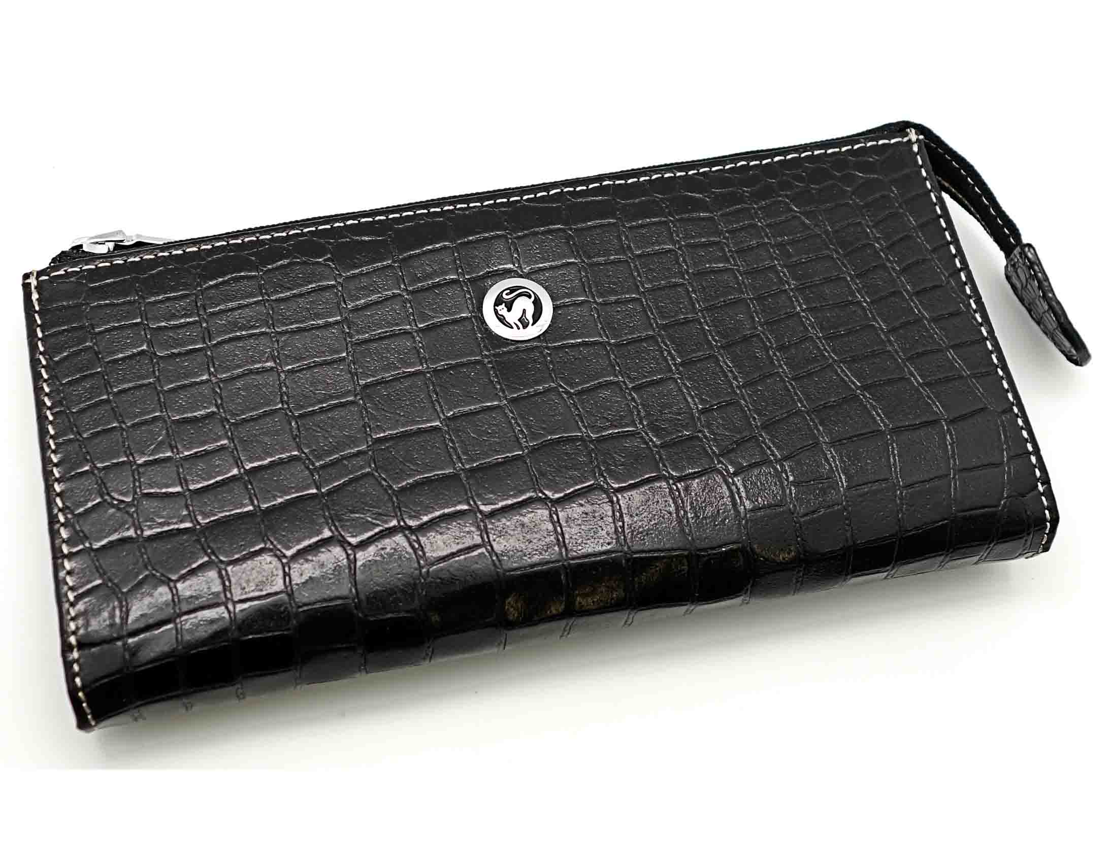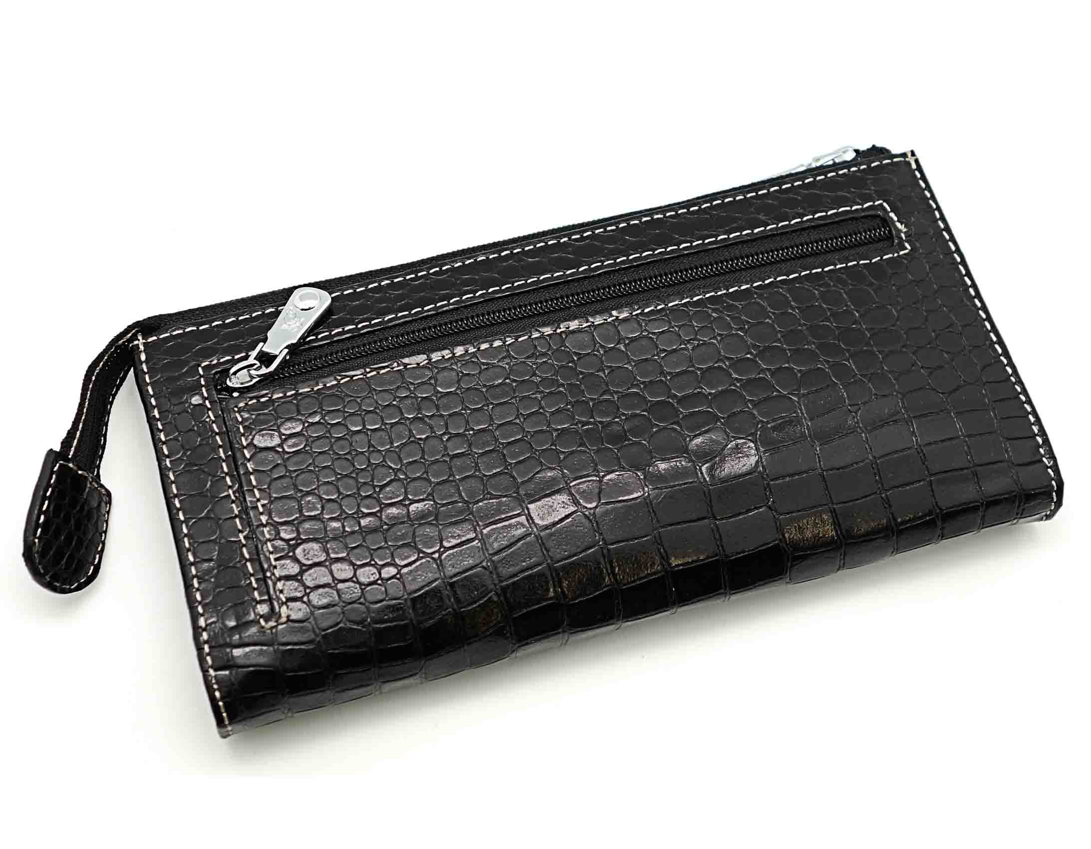 Размер 18.5х9.5 см. Закрывается на молнию. Внутри: два отделения и три кармана для купюр, шесть кармашков для карточек и одно прозрачное окошко. Снаружи отделение для монет на молнии.