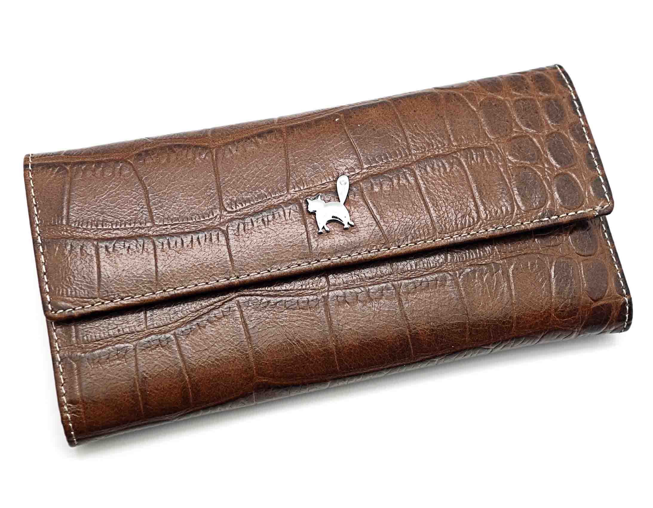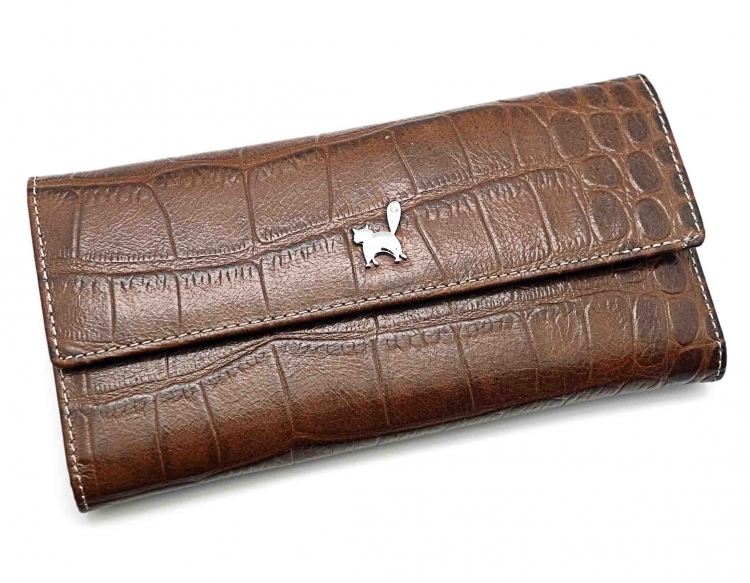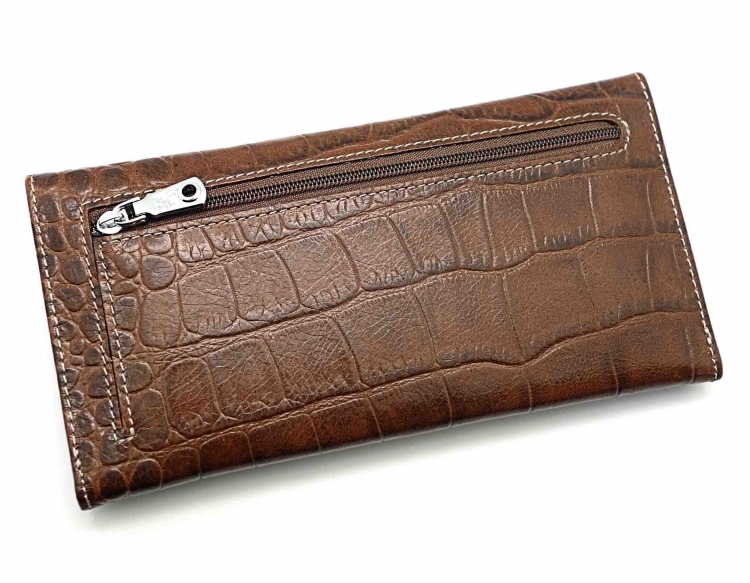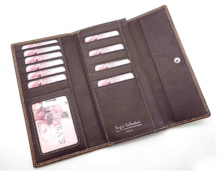 Размер 18 х 9,5 см.. Закрывается на кнопку. Внутри - одно отделение и два кармана для купюр,14 кармашков для пластиковых карт, прозрачное окошко для фотографии, продольное отделение в клапане. Снаружи, на оборотной стороне отделение для монет на молнии.