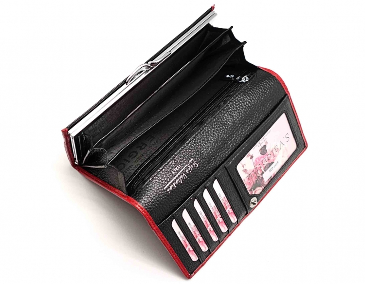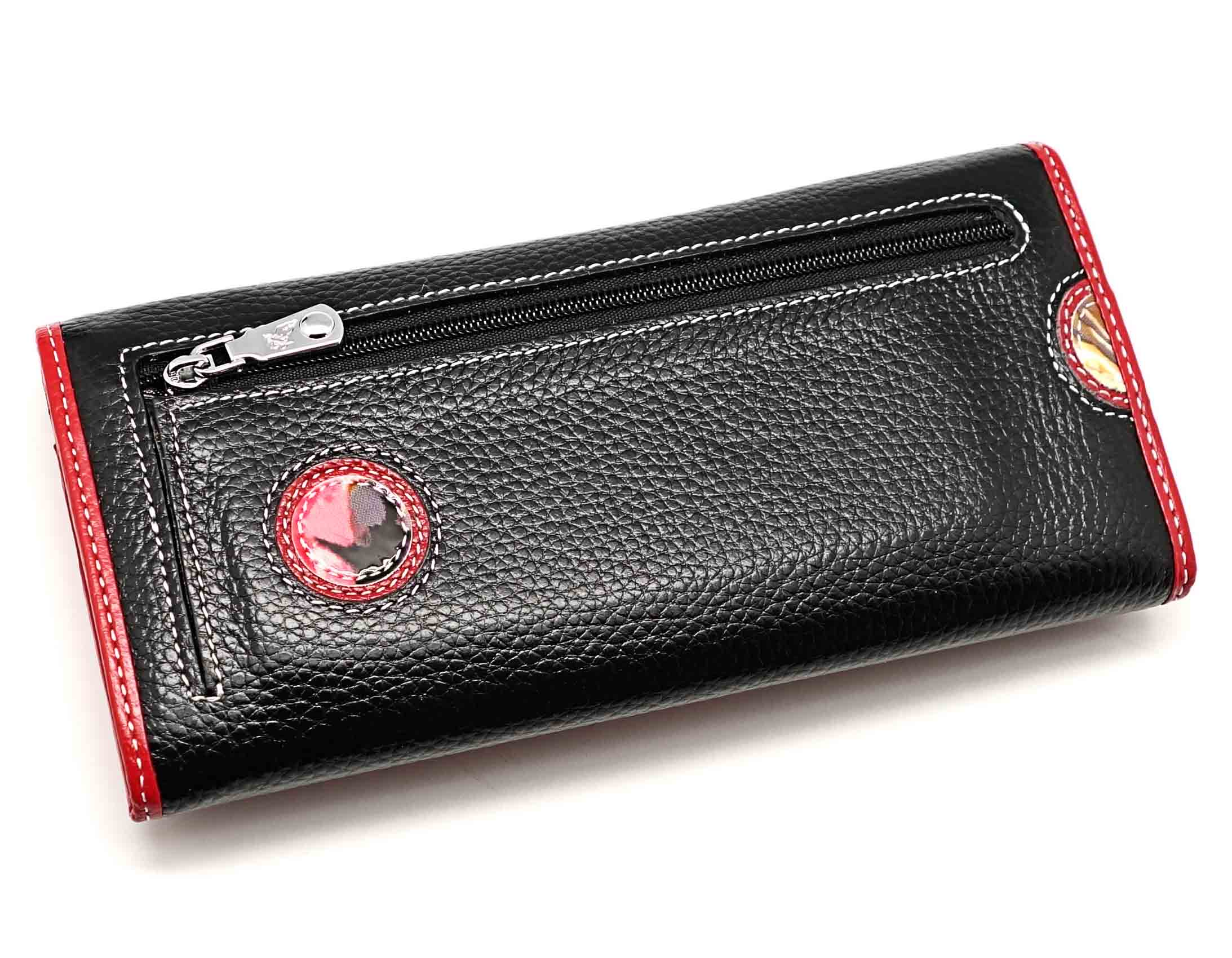 Ограниченная серия аксессуаров, изготовленных из мягкой натуральной кожи и декорированных аппликацией. При производстве этого портмоне использована значительная доля ручного труда. Размер 18,5 х 9 х 2,5 см.. Закрывается на кнопку. Внутри - три отделения и один карман для купюр, два отделения для монет под рамочным замком, карман на молнии, 12 кармашков для пластиковых карт, один продольный карман на створке, прозрачное окошко для фотографии. Снаружи, на оборотной стороне - карман на молнии. Портмоне упаковано в фирменную коробку.