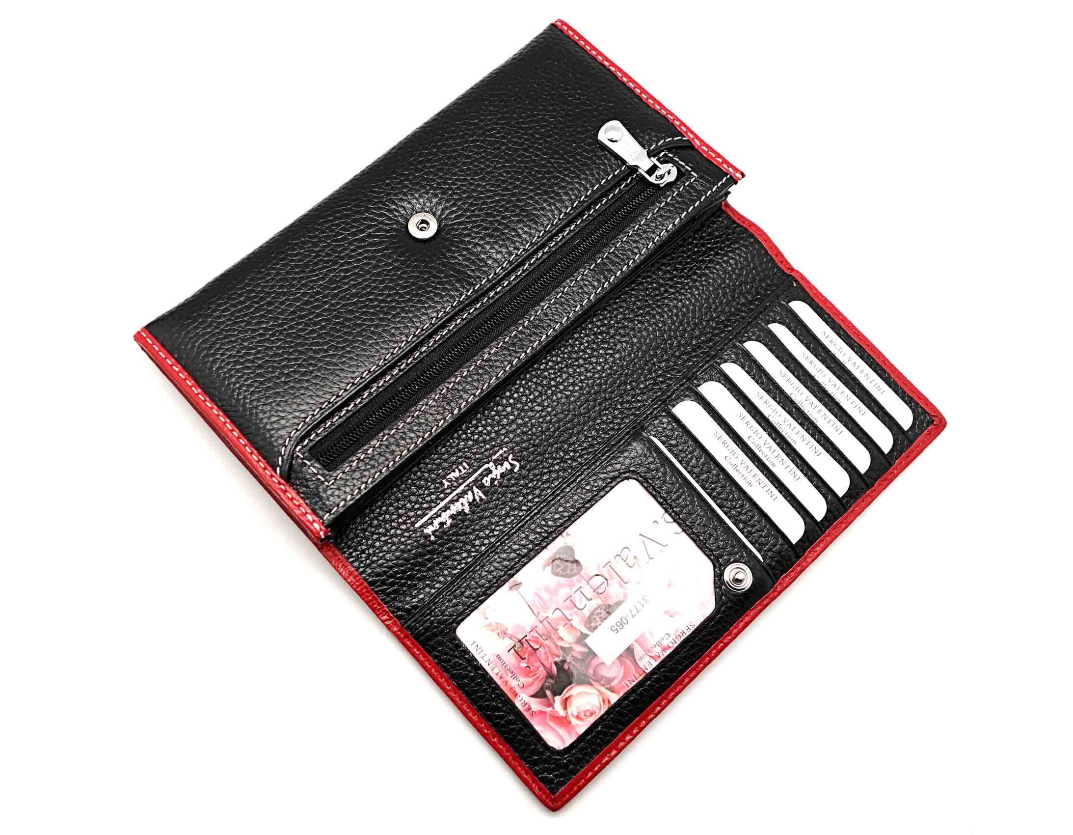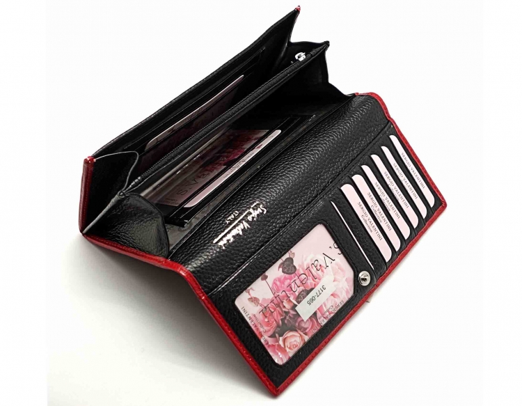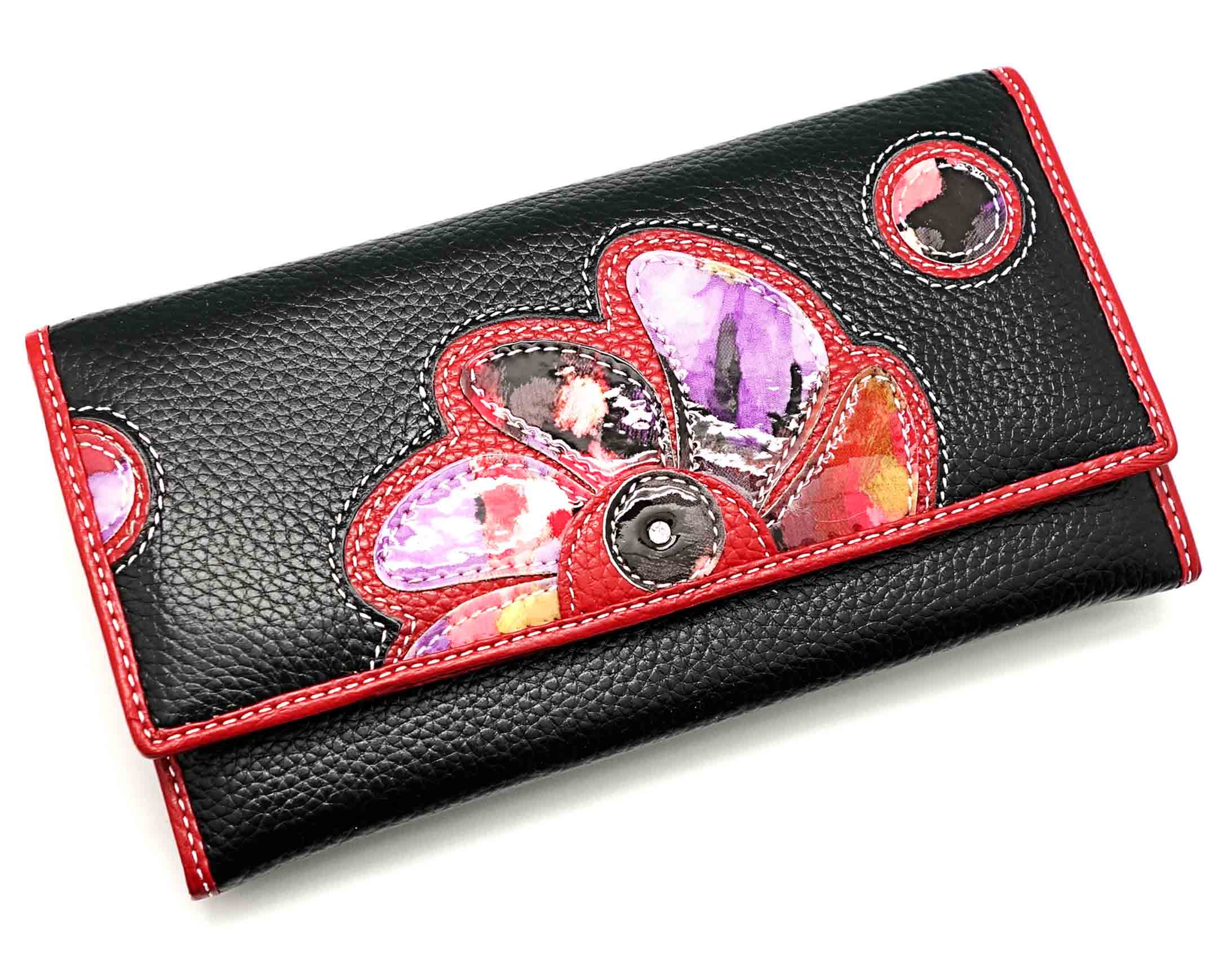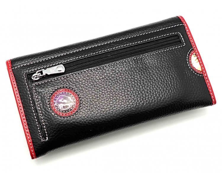 Ограниченная серия аксессуаров, изготовленных из мягкой натуральной кожи и декорированных аппликацией. При производстве этого изделия использована значительная доля ручного труда. Размер 18 х 9,5 см. Закрывается на кнопку. Внутри - два отделения и два кармана для купюр, два кармана на молнии,12 кармашков для пластиковых карт, продольное отделение в клапане, окошко для фотографии. Снаружи, на оборотной стороне- открытый карман и отделение для монет на молнии.