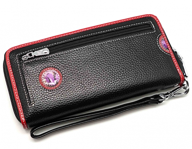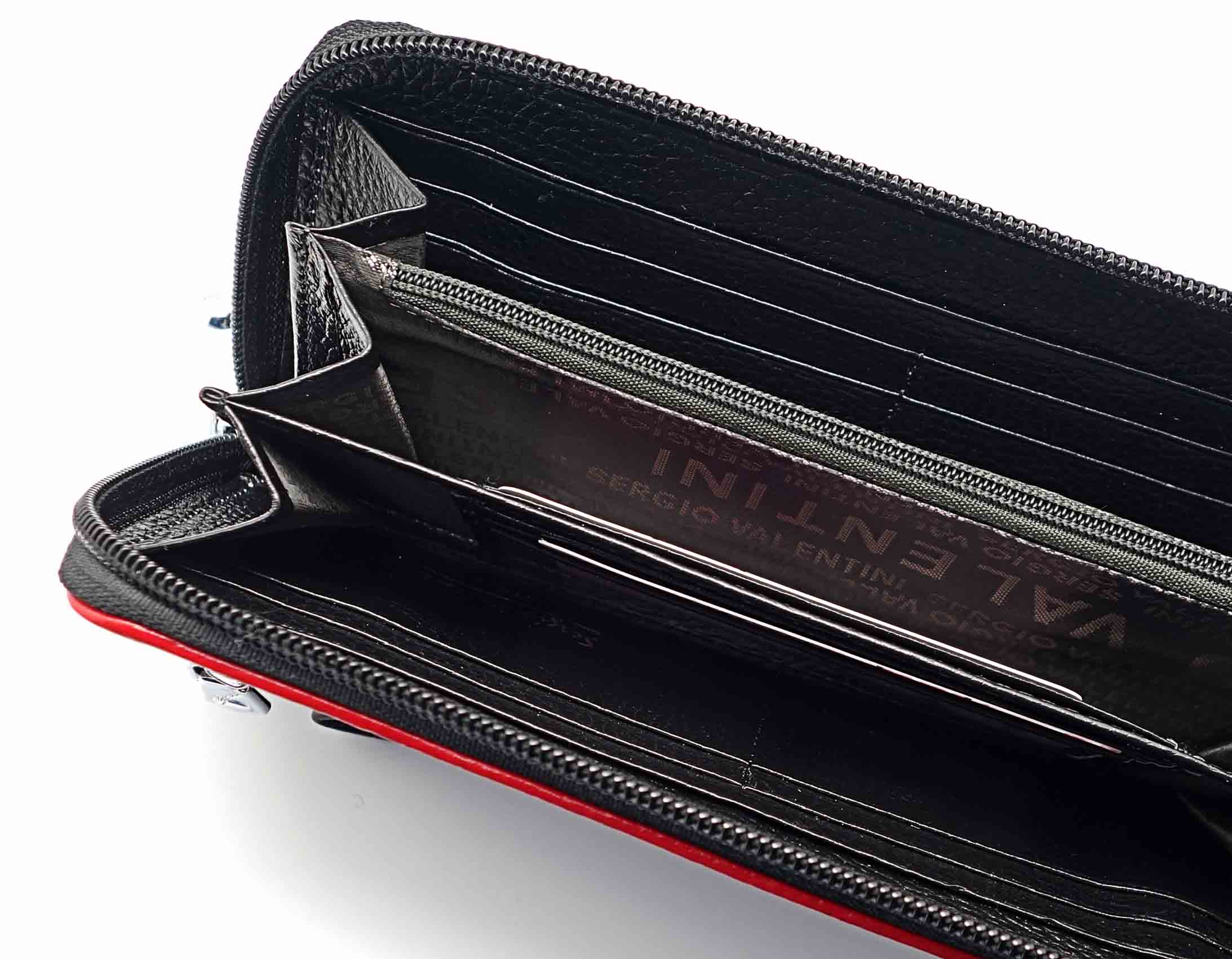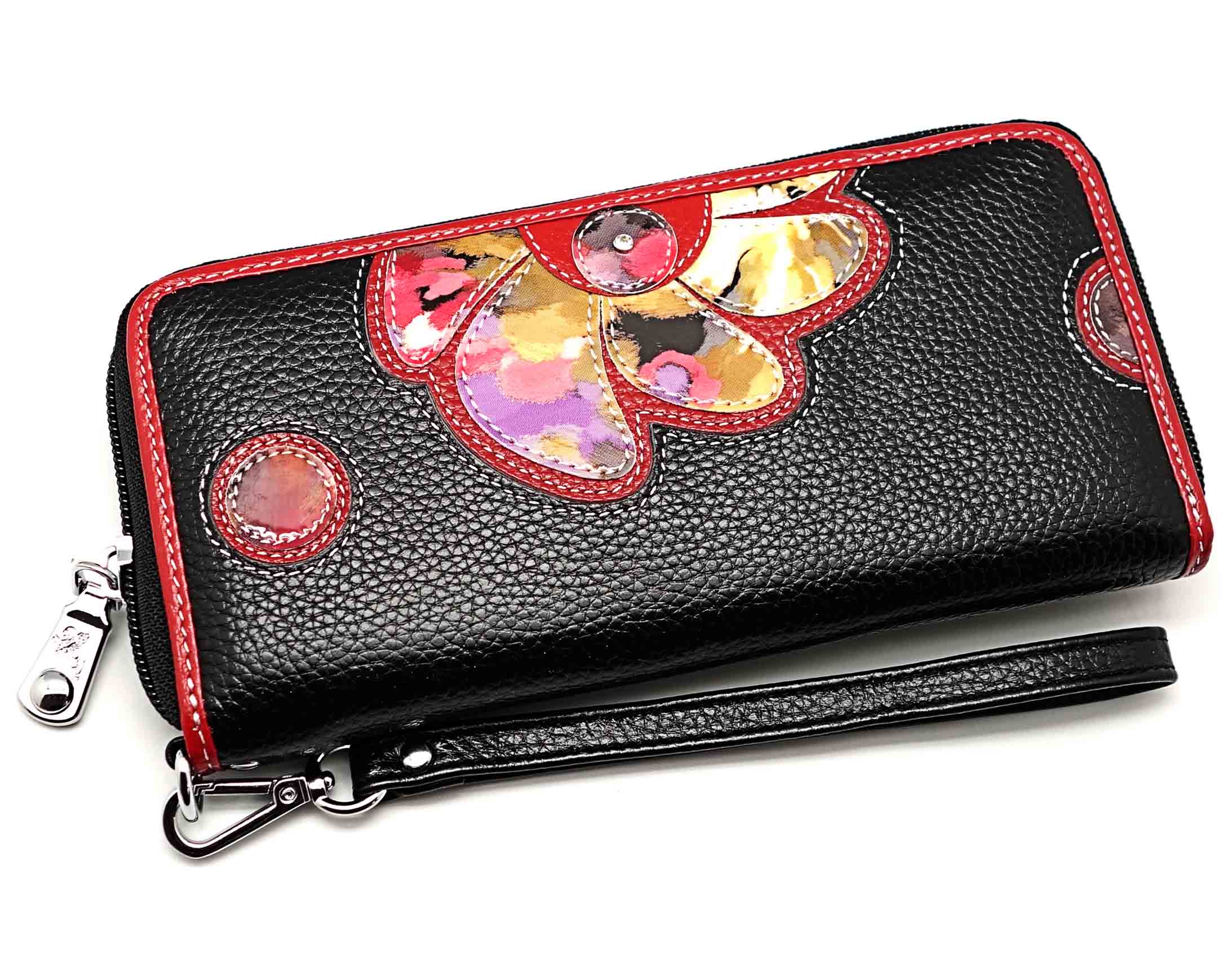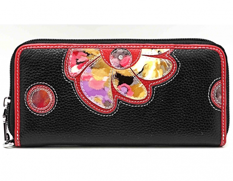 Ограниченная серия аксессуаров, изготовленных из мягкой натуральной кожи и декорированных аппликацией. При производстве этого изделия использована значительная доля ручного труда. Размер 19 х 9 х 2 см.. Закрывается на молнию. Внутри - три отделения и два кармана для купюр, отделение для монет на молнии, 15 кармашков для пластиковых карт. Снаружи: на оборотной стороне карман на молнии, в нижней левой части металлическое полукольцо для крепления кожаного ремешка с карабином. Портмоне упаковано в фирменную коробку.