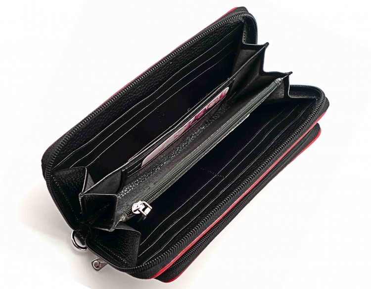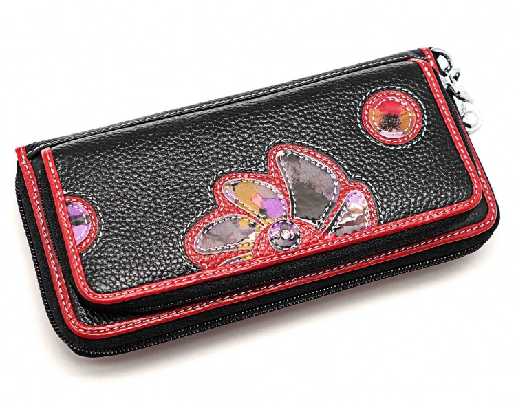 Ограниченная серия аксессуаров, изготовленных из мягкой натуральной кожи и декорированных аппликацией. При производстве этого портмоне использована значительная доля ручного труда. Размер 19,5 х 9,5 х 4 см.. Закрывается на молнию. Внутри - три отделения и два кармана для купюр, отделение на молнии, 15 кармашков для пластиковых карт. Снаружи: на лицевой стороне отделение для монет на молнии, на оборотной стороне карман на молнии, в нижней левой части металлическое полукольцо для крепления кожаного ремешка с карабином. Портмоне упаковано в подарочную коробку.