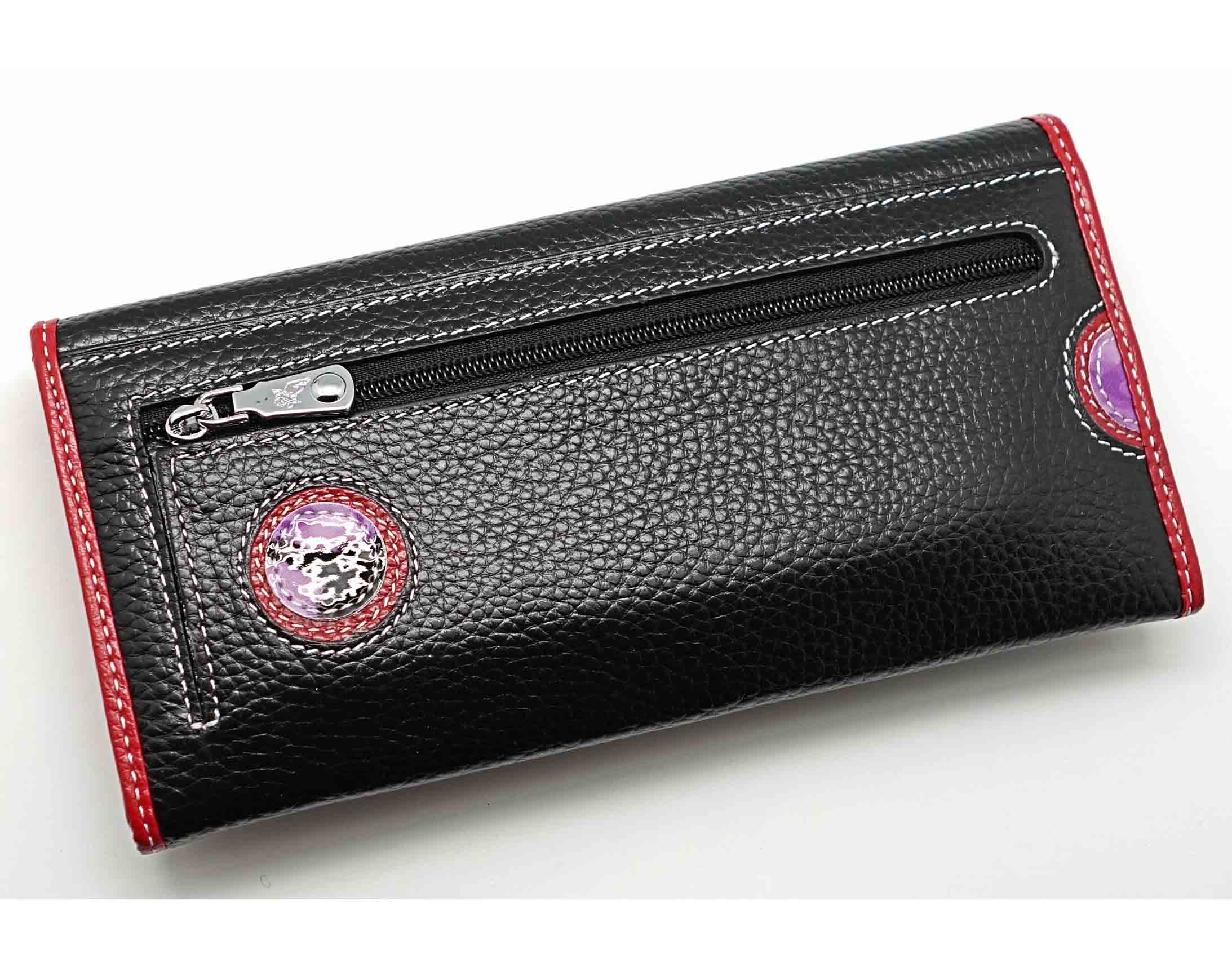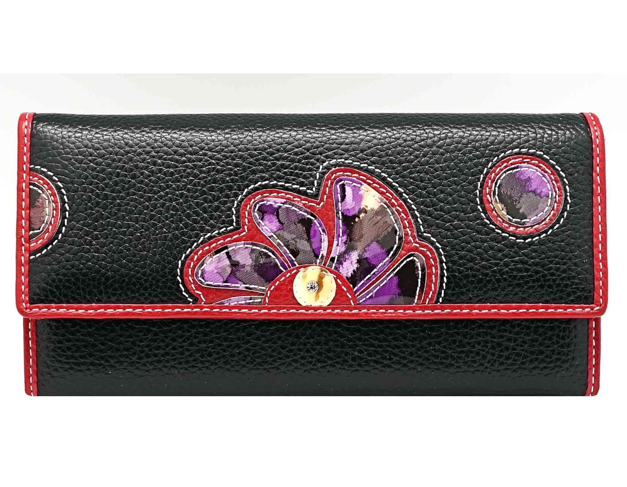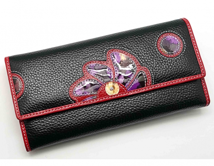 Ограниченная серия аксессуаров, изготовленных из мягкой натуральной кожи и декорированных аппликацией. При производстве этого портмоне использована значительная доля ручного труда. Размер 18,5 х 9,5 см.. Закрывается на кнопку. Внутри - три отделения и два кармана для купюр, девять кармашков для пластиковых карт, отделение на молнии. Снаружи, на оборотной стороне, отделение для монет на молнии.