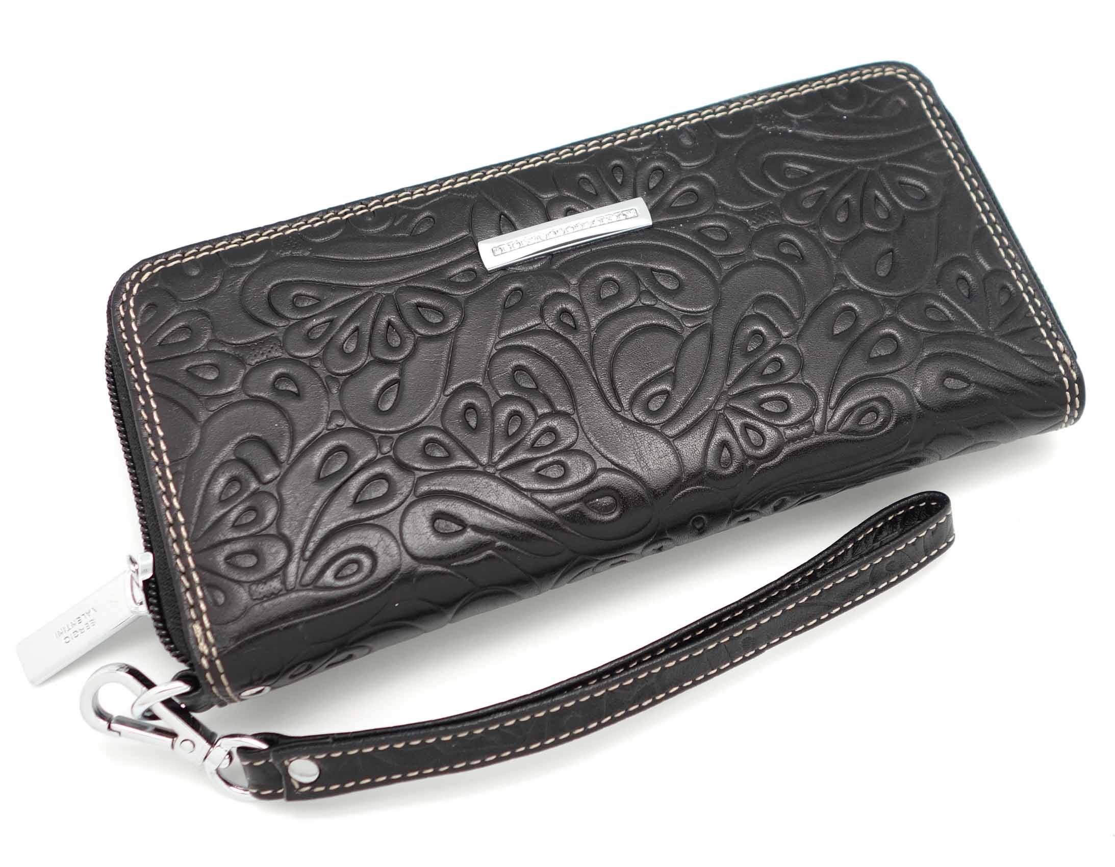 Размер 19 х 9,5 см.. Закрывается на молнию. Внутри - три отделения и два кармана для купюр, отделение для монет на молнии, 15 кармашков для пластиковых карт. Снаружи: на оборотной стороне карман на молнии, в нижней левой части металлическое полукольцо для крепления кожаного ремешка с карабином.