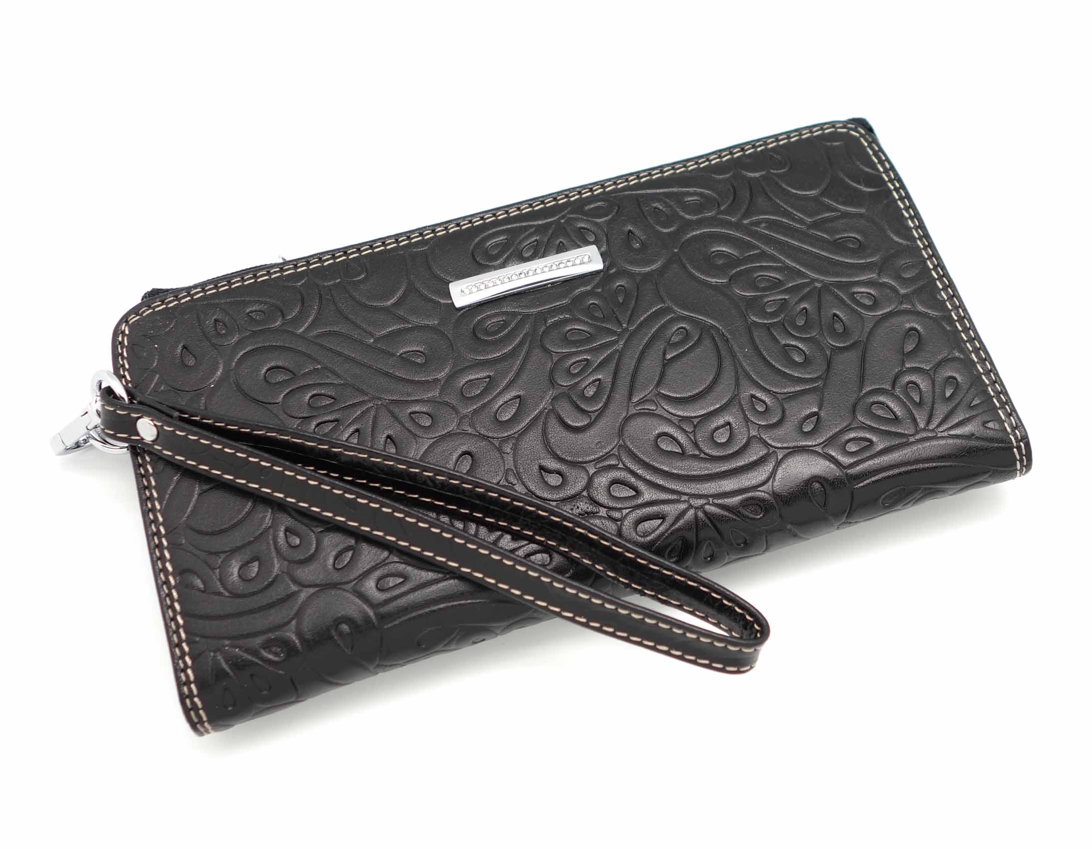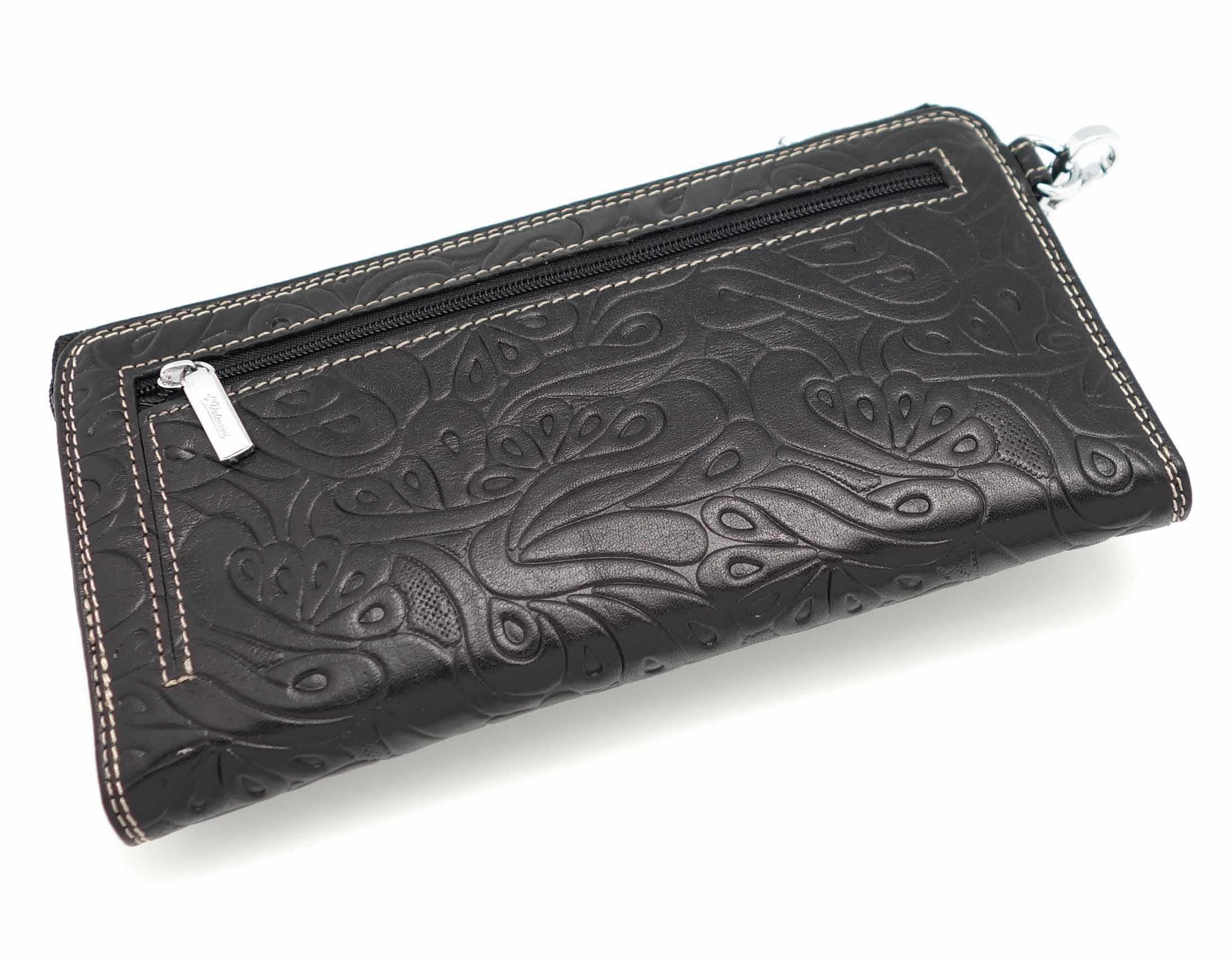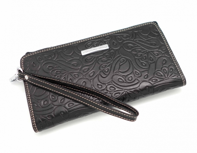 Размер 20 х 10 см.. Закрывается на молнию. Внутри - два отделения и два кармана для купюр, отделение для монет на молнии, 14 кармашков для пластиковых карт. Снаружи: на оборотной стороне карман на молнии, в левой части металлическое полукольцо для крепления кожаного ремешка с карабином.
