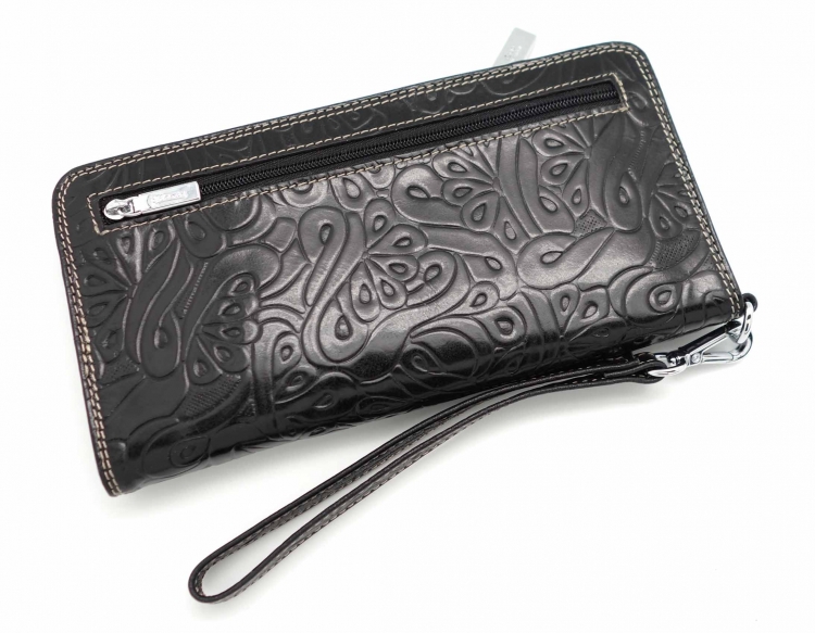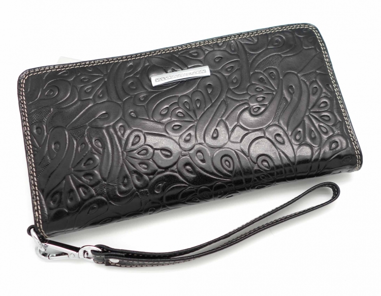 Размер 20х10,5 см. Закрывается на молнию. Внутри: два отделения и два кармана для купюр, один карман на молнии, 8 кармашков для пластиковых карт. Снаружи, на оборотной стороне: отделение для монет на молнии. К портмоне пристёгивается кожаный ремешок.