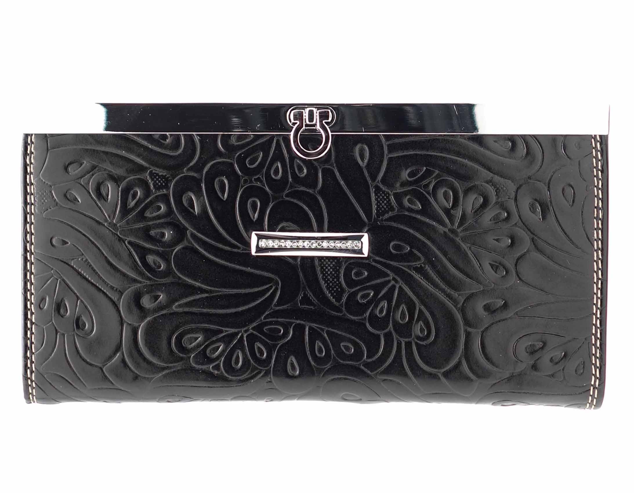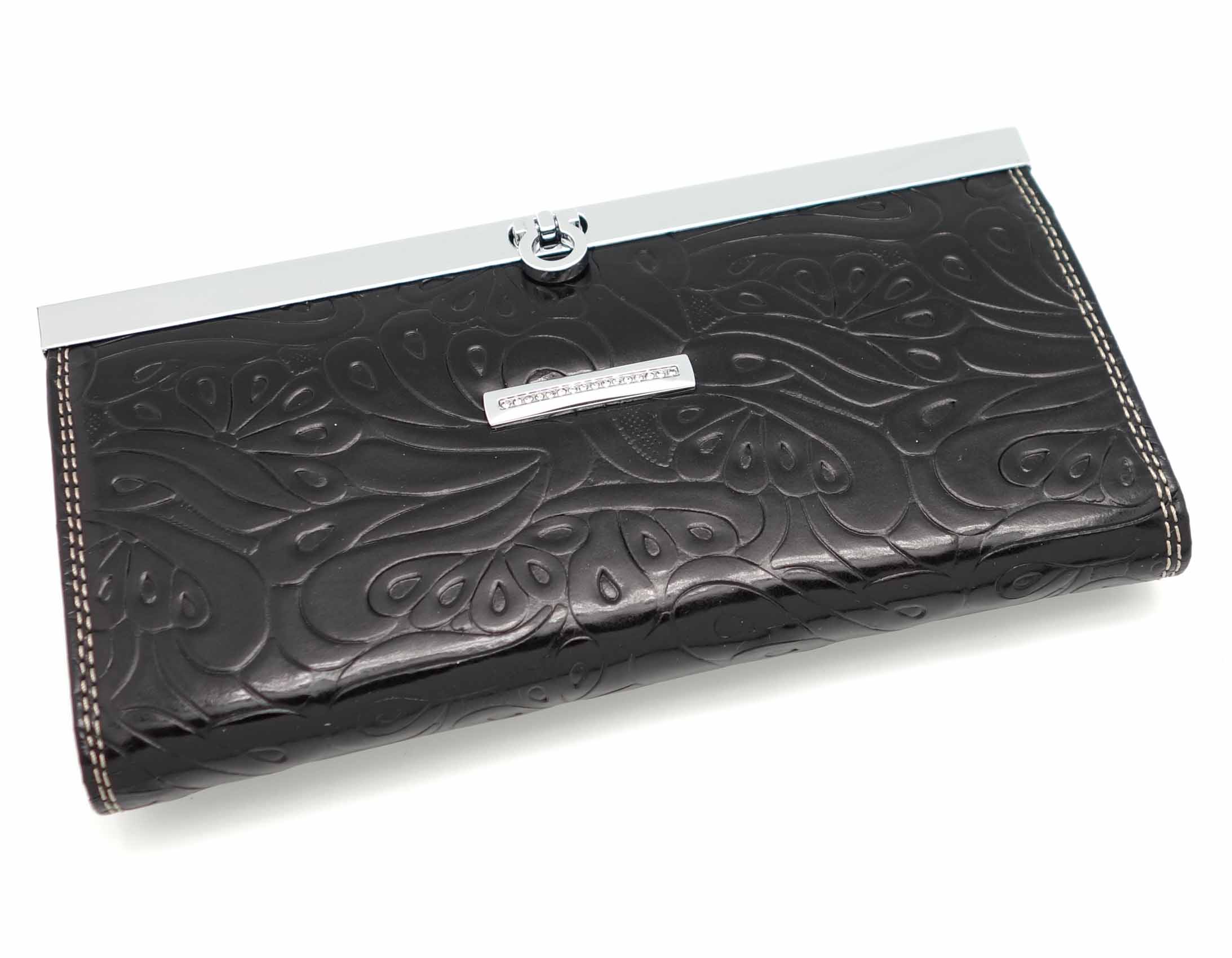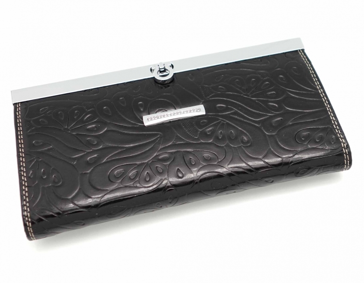 Размер 19 х 10 см. Закрывается на рамочный металлический замок. Внутри: три отделения и два кармана для купюр, отделение на молнии, шесть кармашков для пластиковых карт. Снаружи, на оборотной стороне карман на молнии.