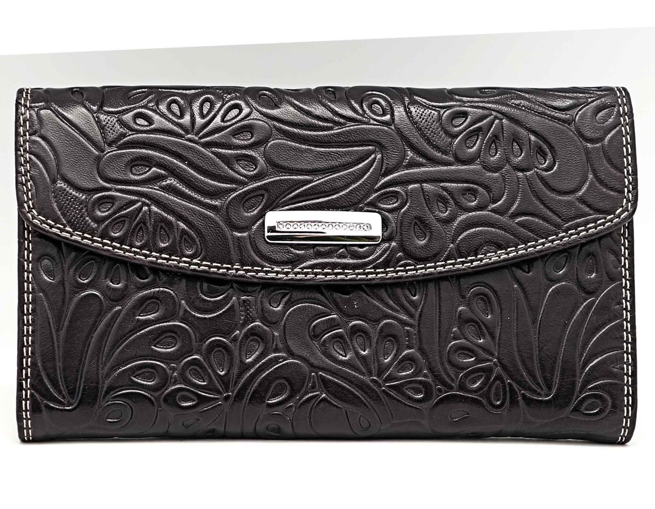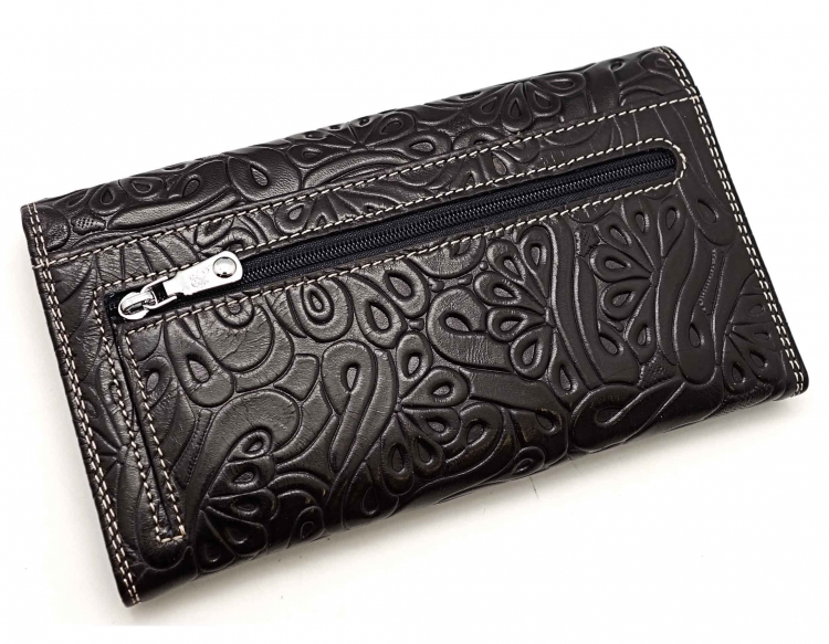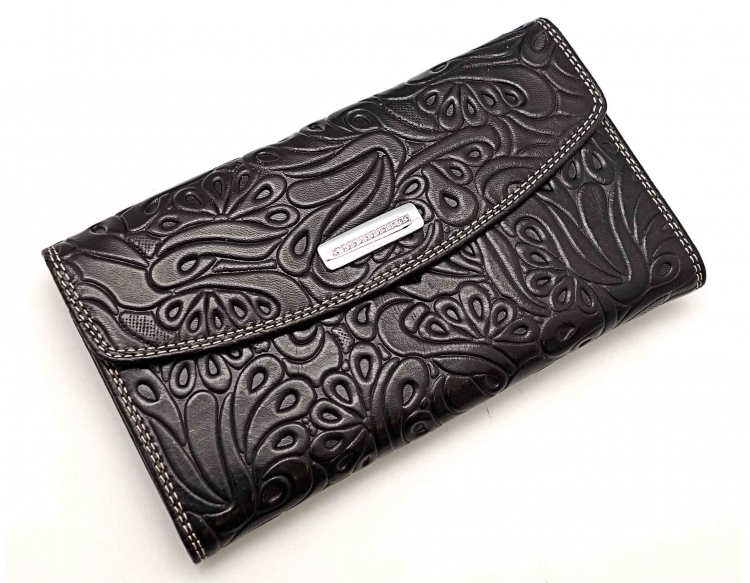 Изготовлено из тиснёной кожи тёмно-синего цвета. Размер 18,5 х 10,5 см.. Закрывается на кнопку. Внутри - два отделения и три кармана для купюр, 8 кармашков для пластиковых карт, продольное отделение в клапане. Снаружи, на оборотной стороне - карман без застёжки и отделение для монет на молнии.