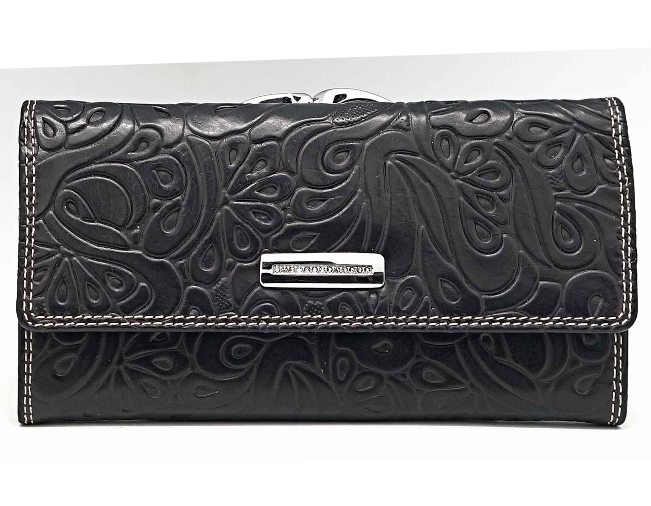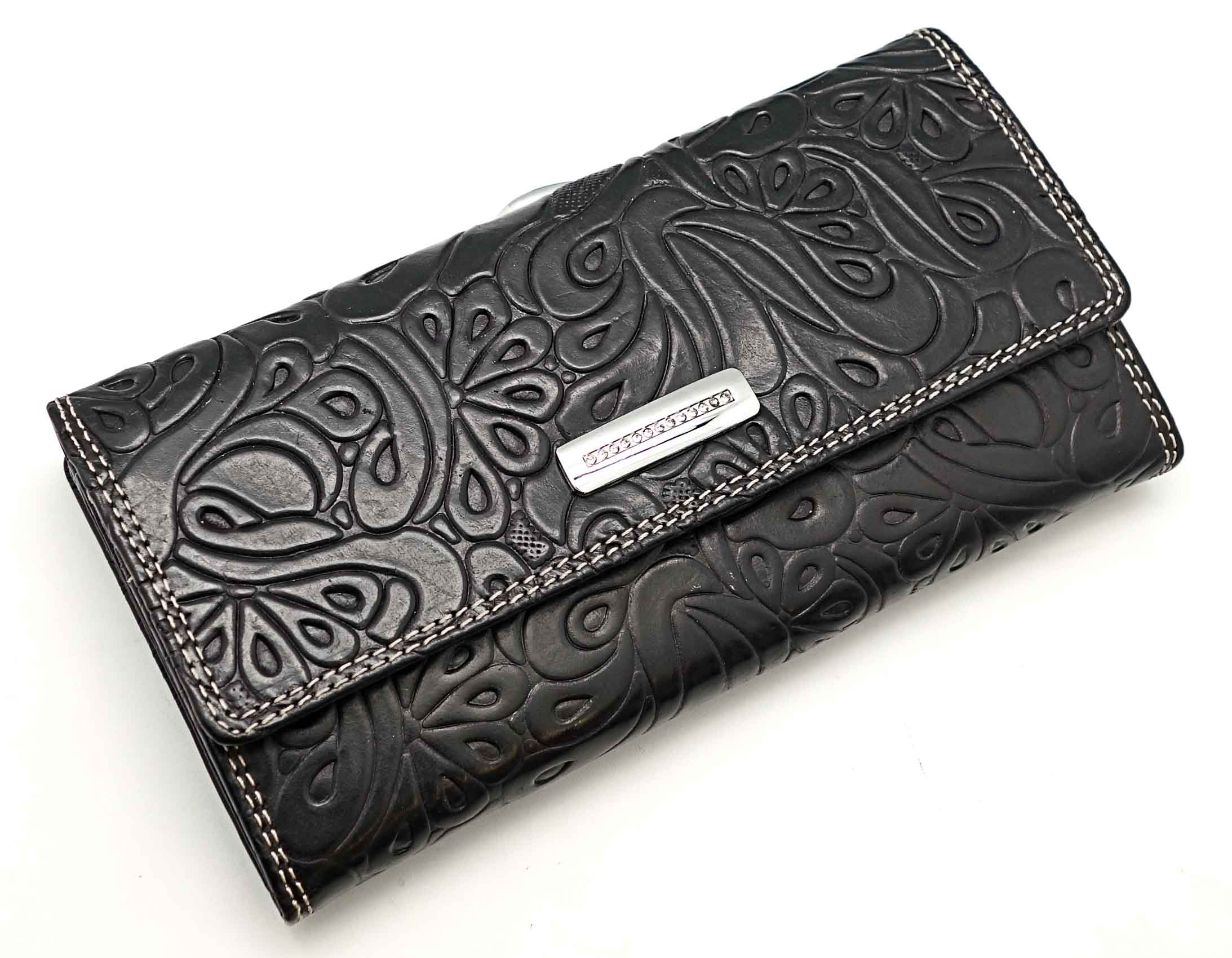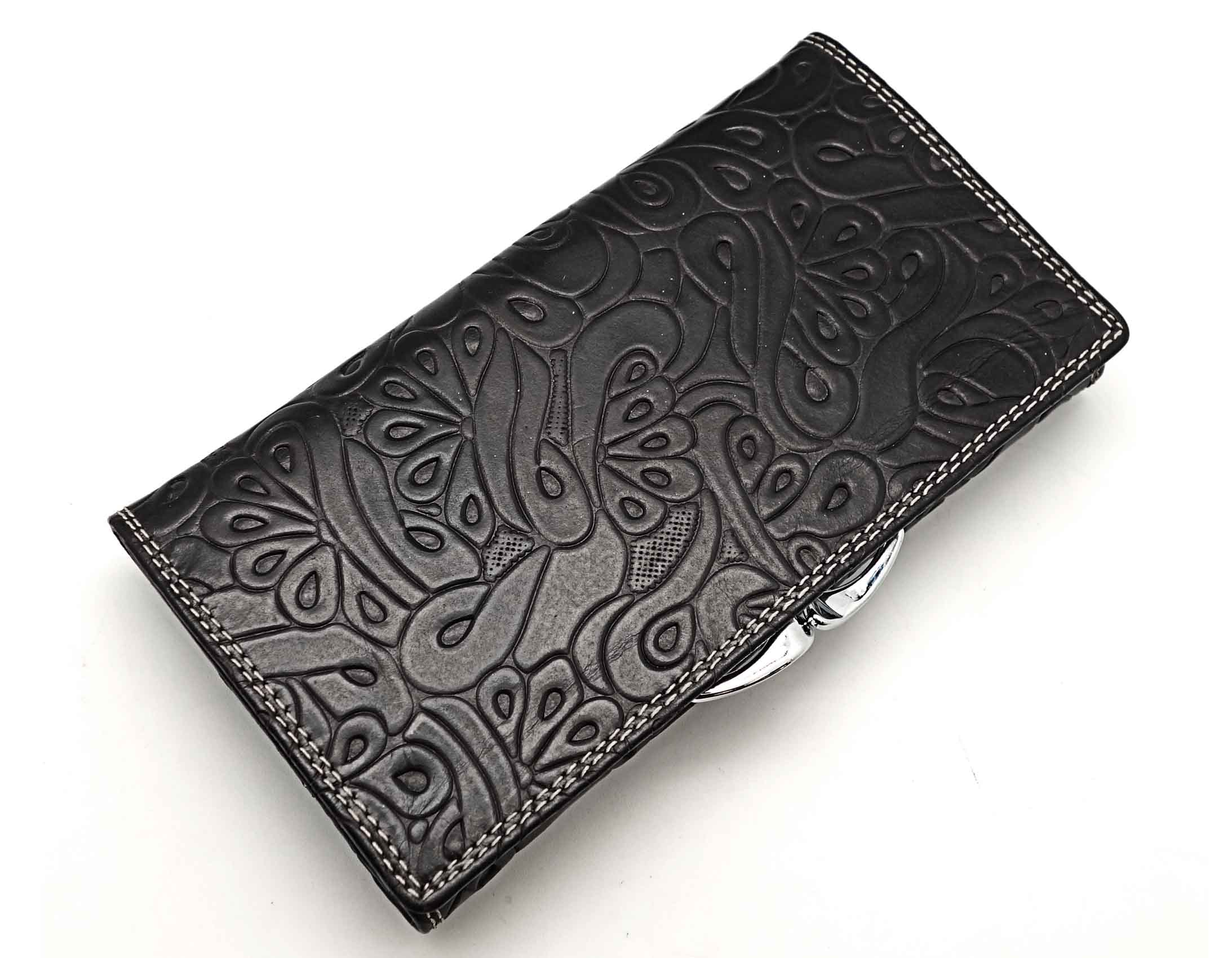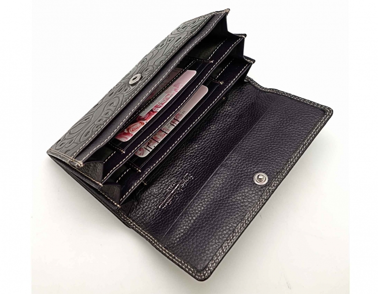 Изготовлено из тиснёной кожи тёмно-синего цвета. Размер 17 х 9 см. Закрывается на кнопку. Внутри: три отделения и карман для купюр, девять кармашков для пластиковых карт, узкий продольный карман на клапане. Снаружи, на оборотной стороне: два отделения для монет под рамочным замком.