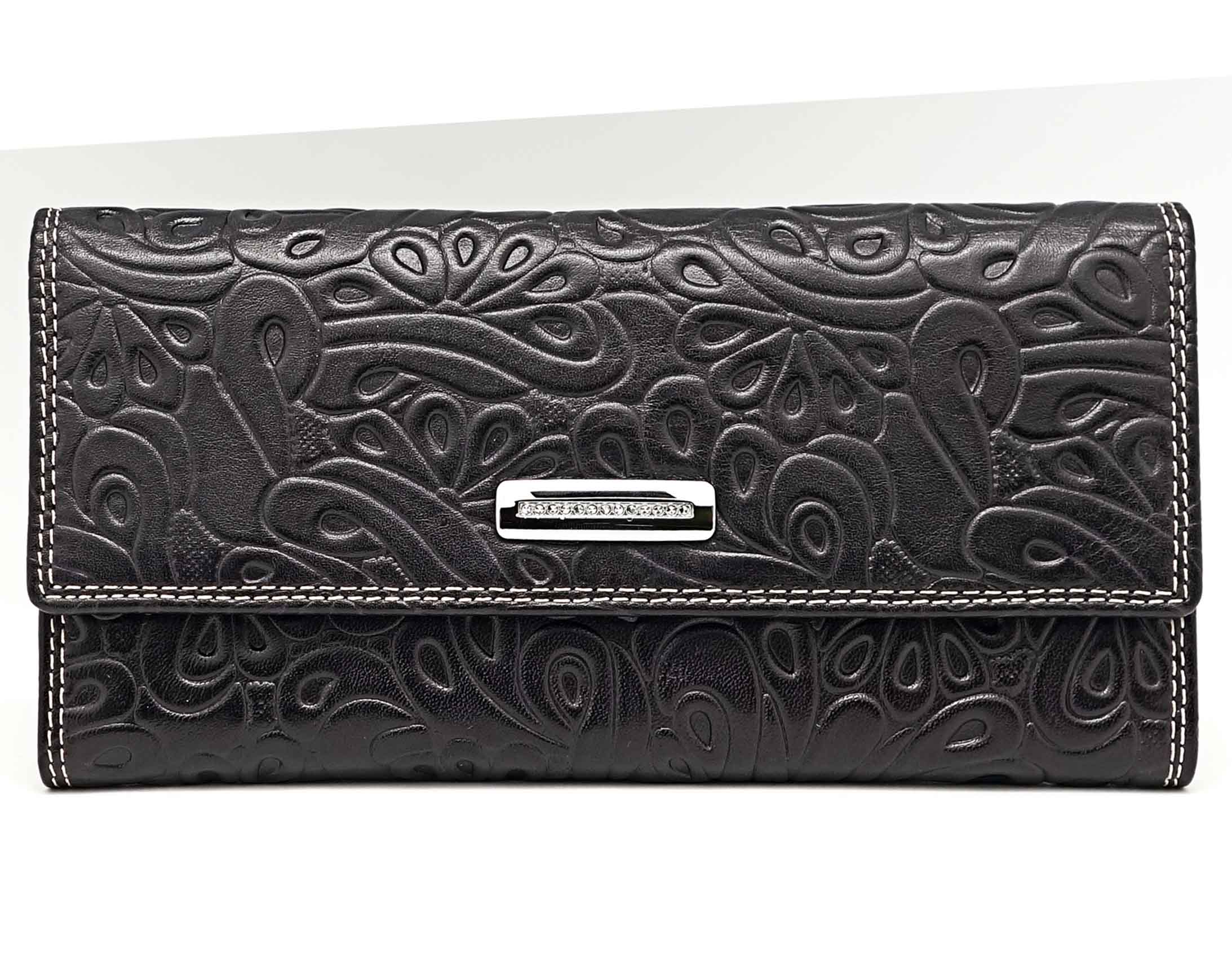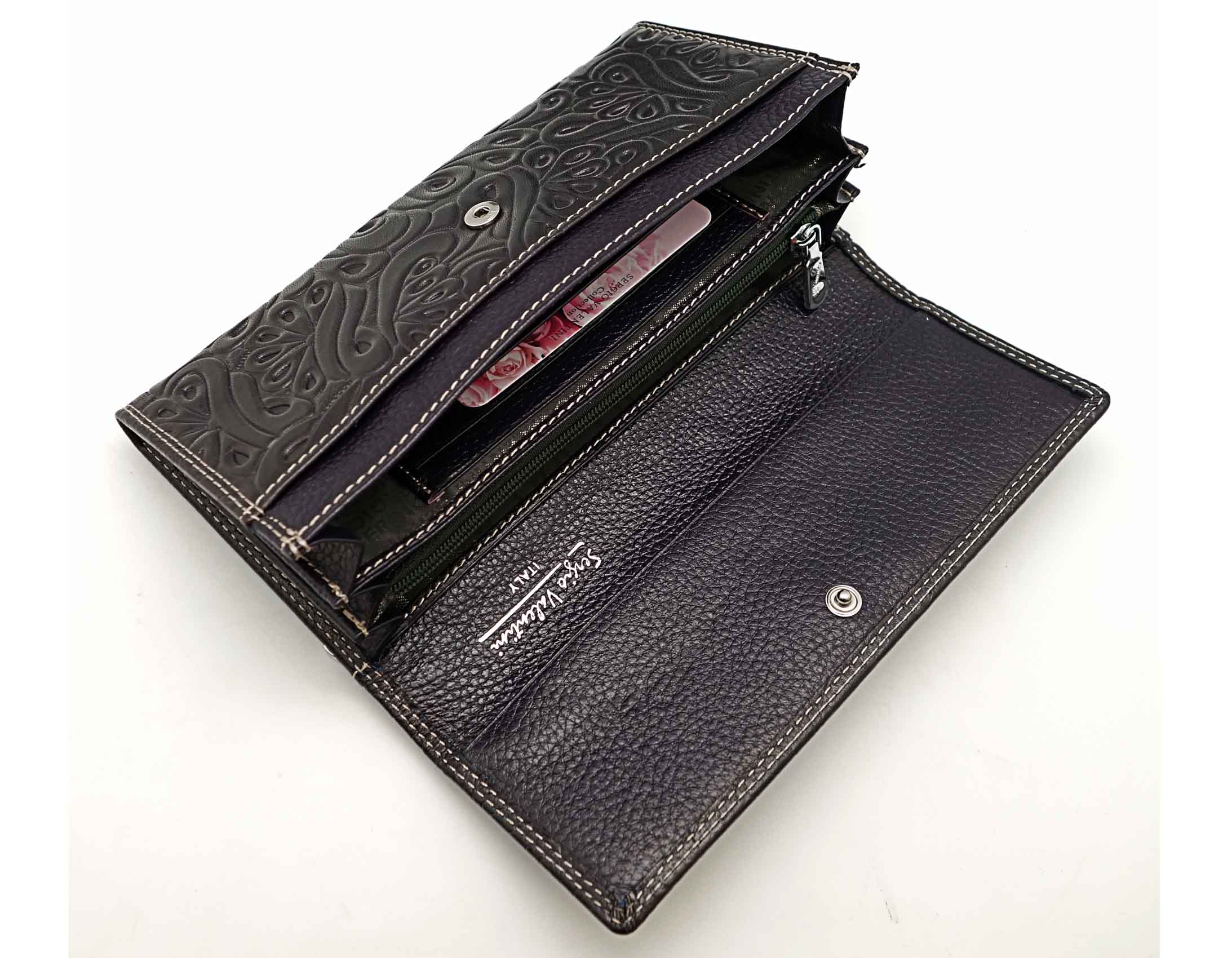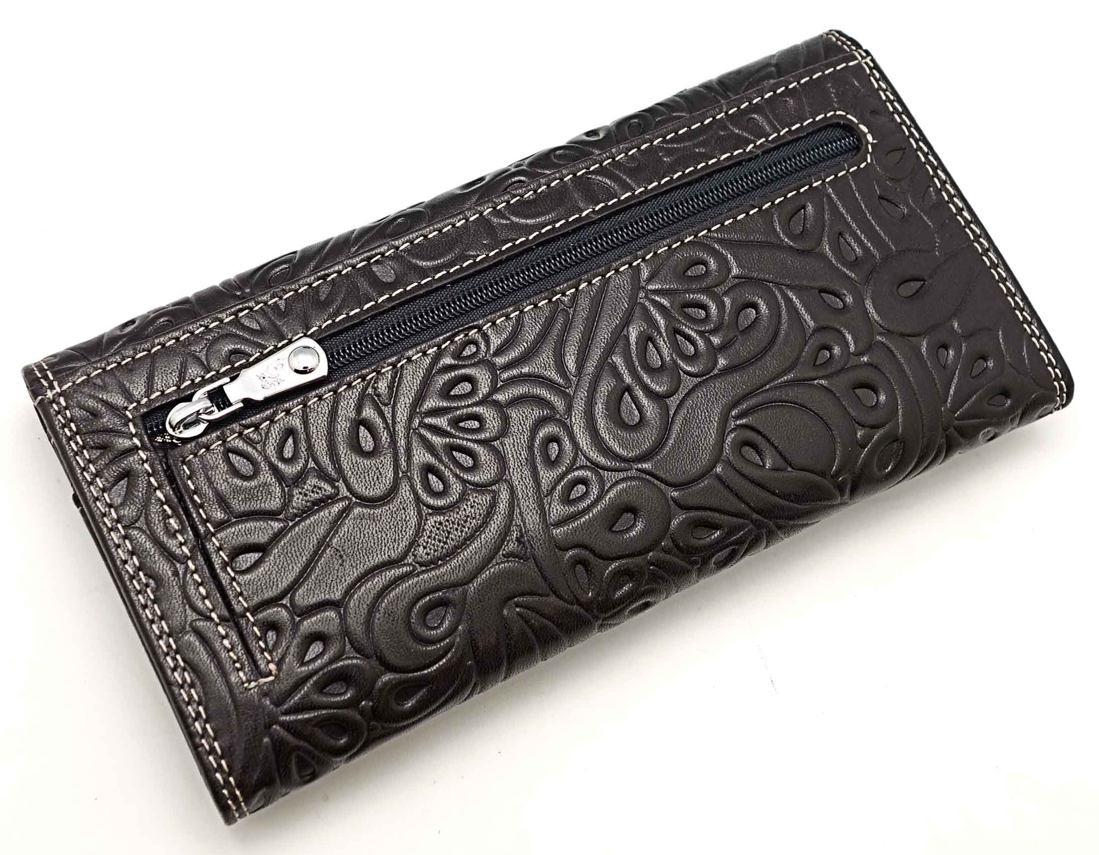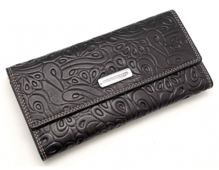 Изготовлено из тиснёной кожи тёмно-синего цвета. Размер 18,5 х 9,5 см.. Закрывается на кнопку. Внутри - три отделения и два кармана для купюр, девять кармашков для пластиковых карт, отделение на молнии. Снаружи, на оборотной стороне, отделение для монет на молнии.