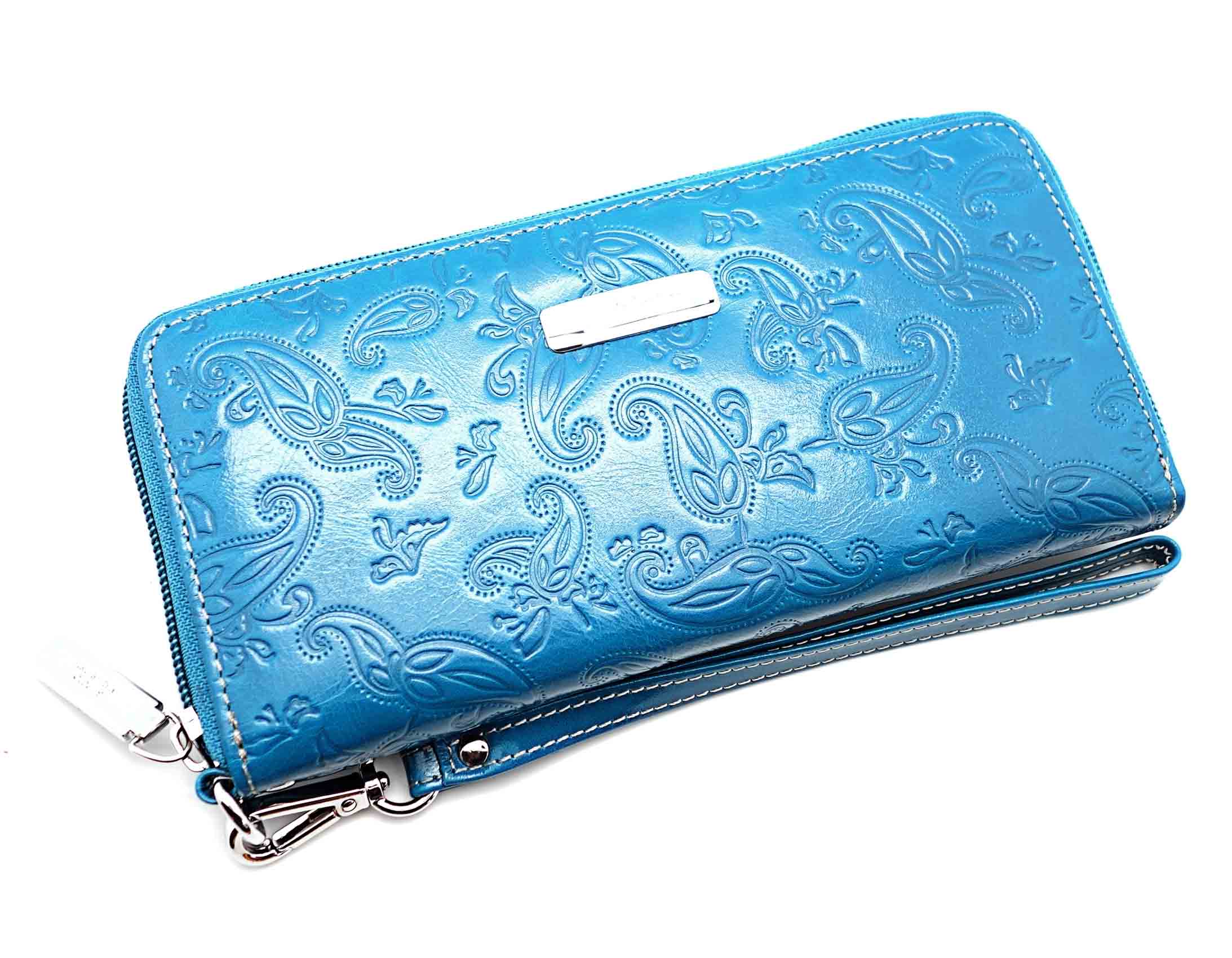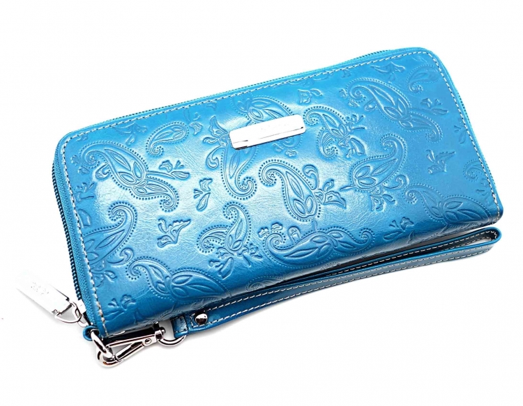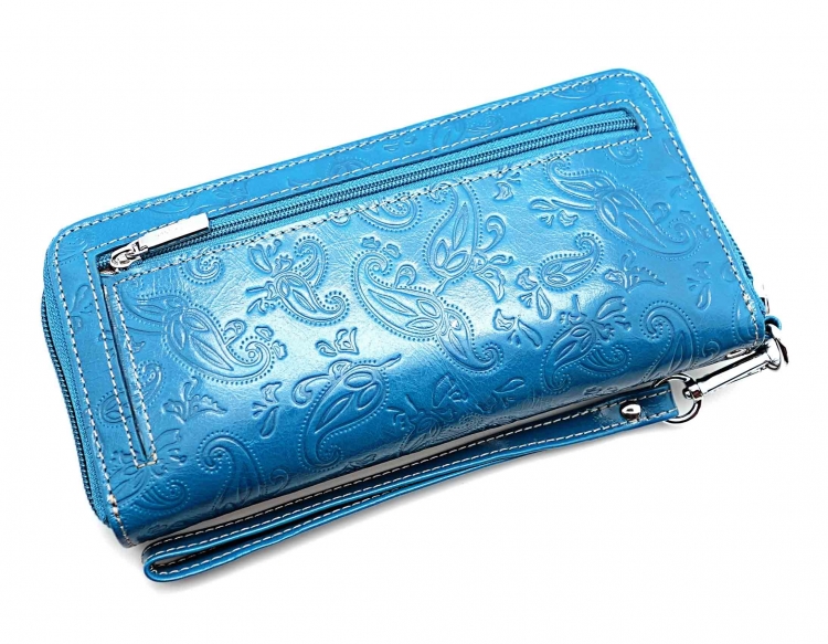 Размер 19 х 9,5 см.. Закрывается на молнию. Внутри - три отделения и два кармана для купюр, отделение для монет на молнии, 15 кармашков для пластиковых карт. Снаружи: на оборотной стороне карман на молнии, в нижней левой части металлическое полукольцо для крепления кожаного ремешка с карабином.