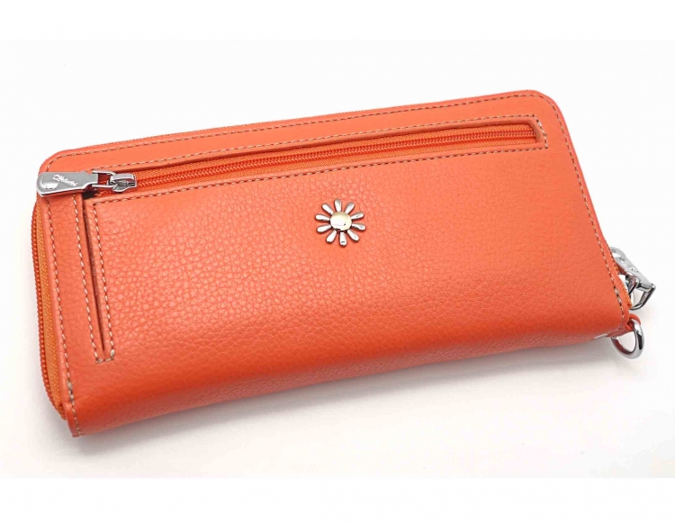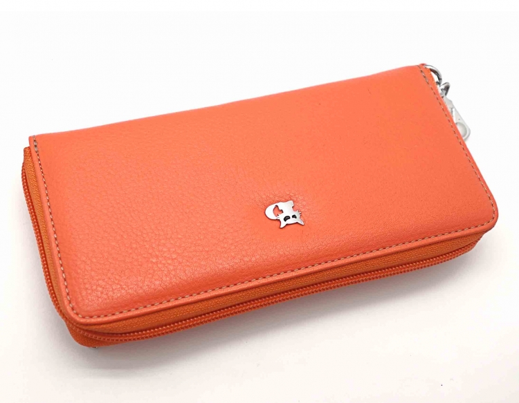 Размер 19 х 9,5 см.. Закрывается на молнию. Внутри - три отделения и два кармана для купюр, отделение для монет на молнии, 15 кармашков для пластиковых карт. Снаружи: на оборотной стороне карман на молнии, в нижней левой части металлическое полукольцо для крепления кожаного ремешка с карабином.