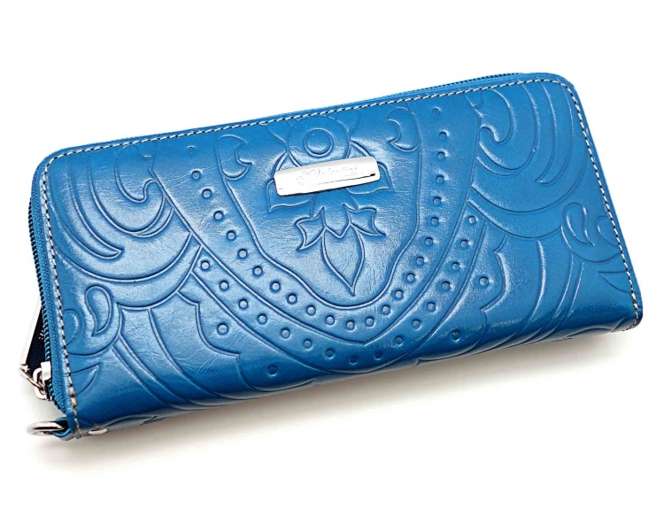 Размер 19 х 9,5 см.. Закрывается на молнию. Внутри - три отделения и два кармана для купюр, отделение для монет на молнии, 15 кармашков для пластиковых карт. Снаружи: на оборотной стороне карман на молнии, в нижней левой части металлическое полукольцо для крепления кожаного ремешка с карабином.