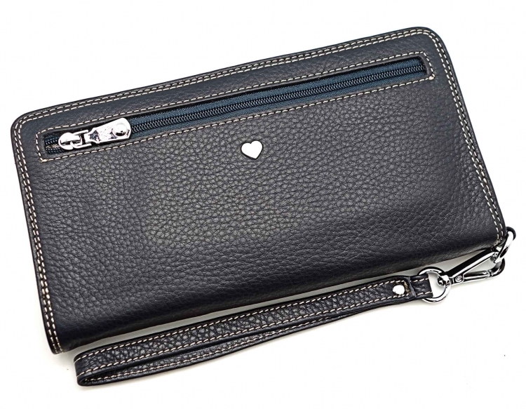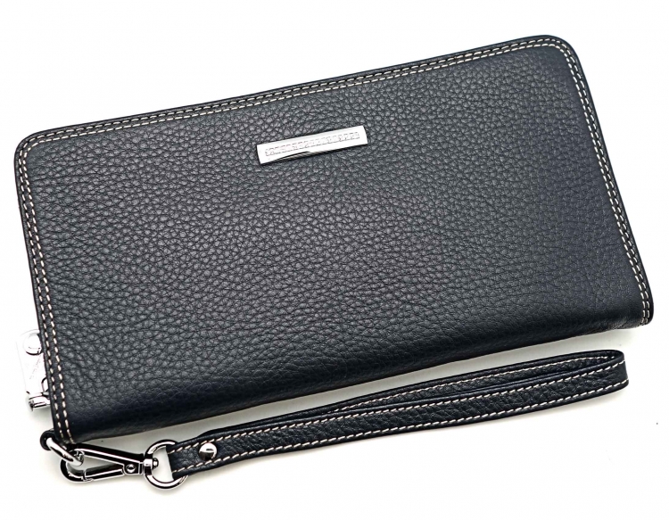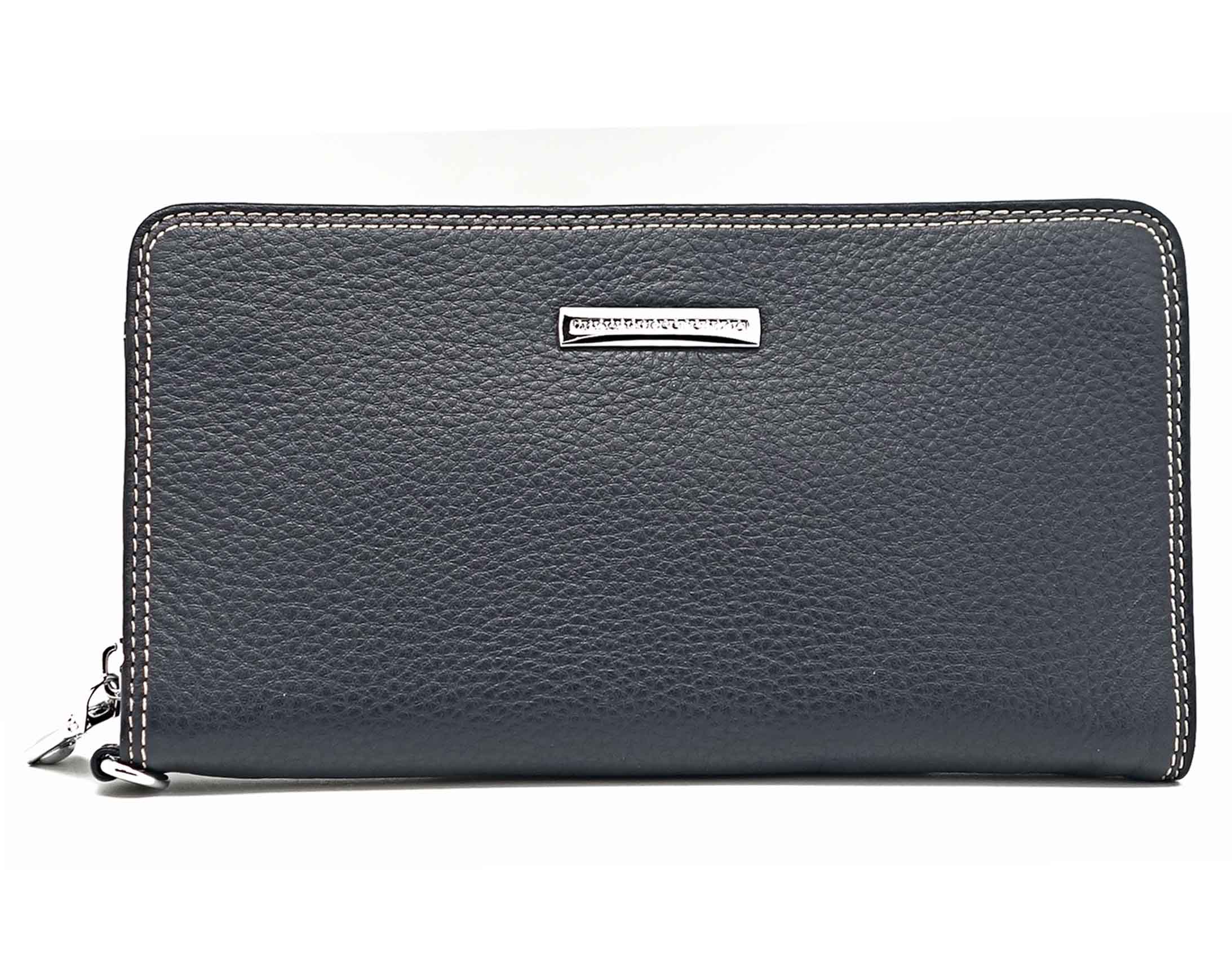 Изготовлено из высококачественной кожи тёмно-синего цвета. Размер 20х10,5 см. Закрывается на молнию. Внутри: два отделения и два кармана для купюр, один карман на молнии, 12 кармашков для пластиковых карт. Снаружи, на оборотной стороне: отделение для монет на молнии. К портмоне пристёгивается кожаный ремешок.