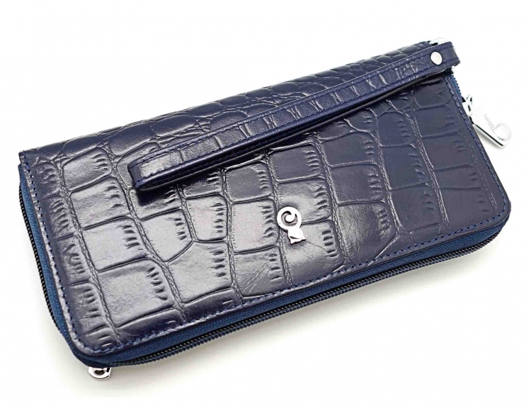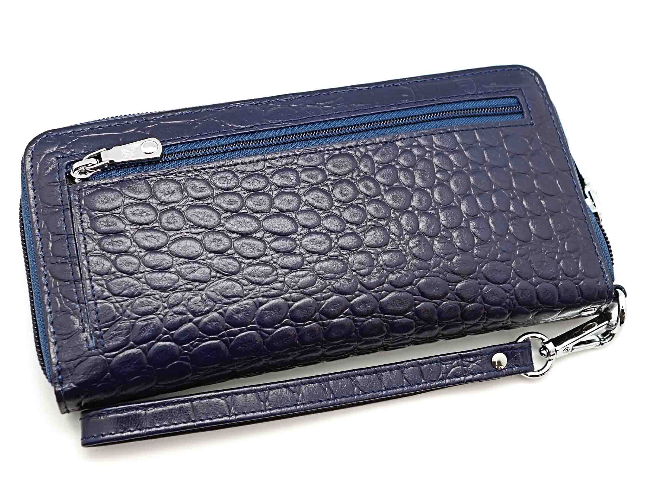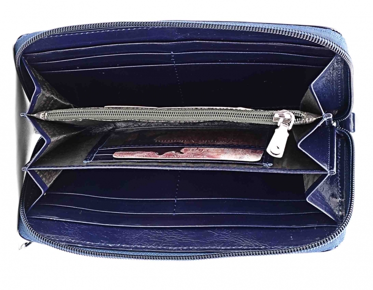 Размер 19 х 9,5 см.. Закрывается на молнию. Внутри - три отделения и два кармана для купюр, отделение для монет на молнии, 15 кармашков для пластиковых карт. Снаружи: на оборотной стороне карман на молнии, в нижней левой части металлическое полукольцо для крепления кожаного ремешка с карабином.