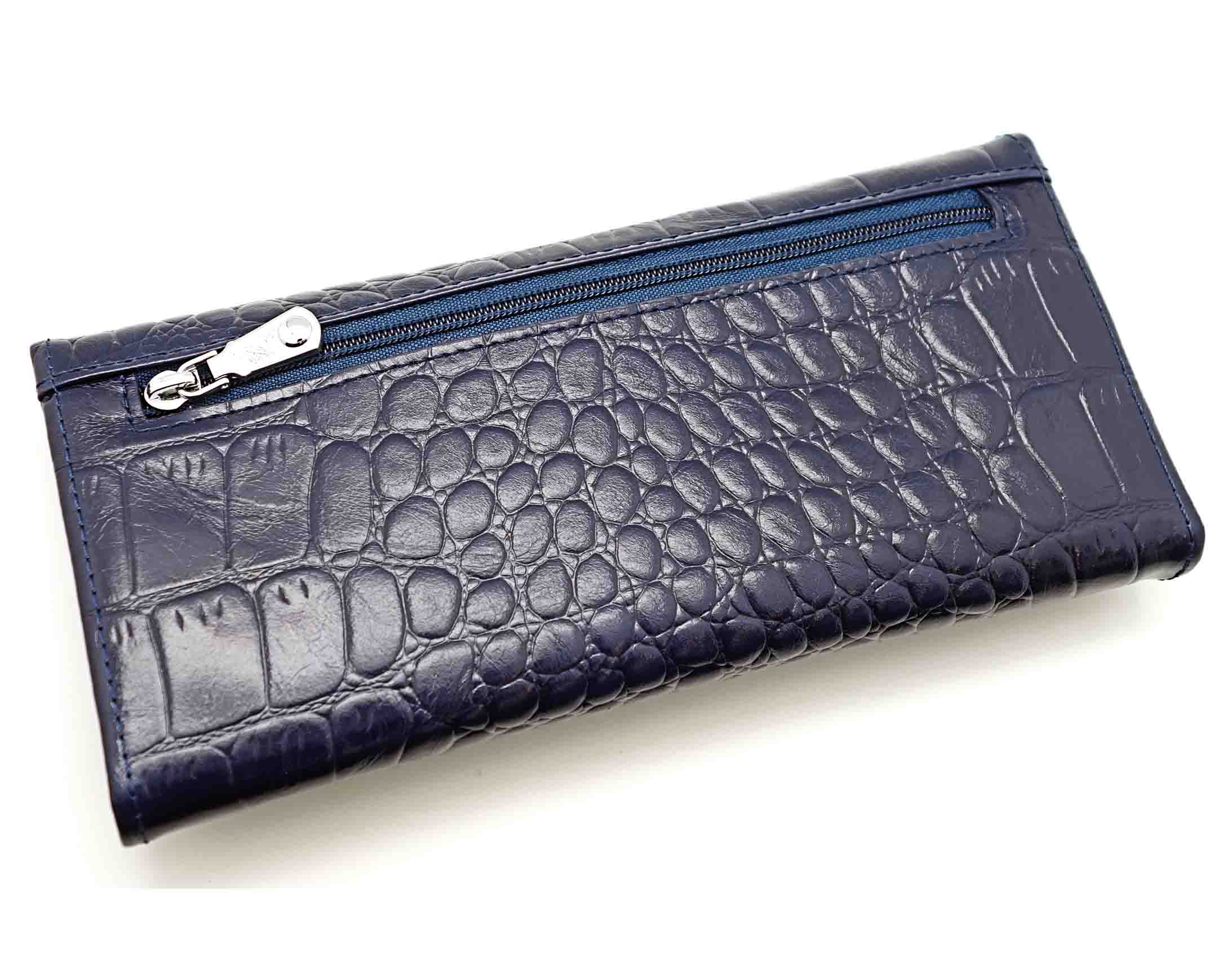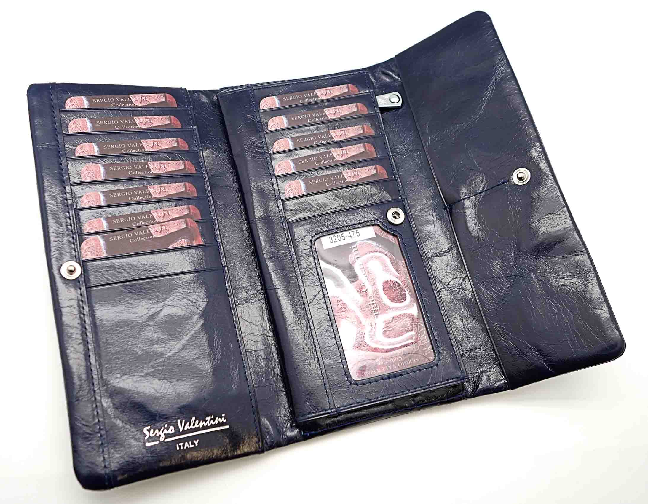 Размер 19х9.5 см. Мягкий, бескаркасный кошелёк, закрывается на кнопку. Внутри - три отделения для купюр, отделение для монет на молнии, 13 кармашков для пластиковых карт, одно окошко для фотографии. Снаружи, на оборотной стороне - карман на молнии.