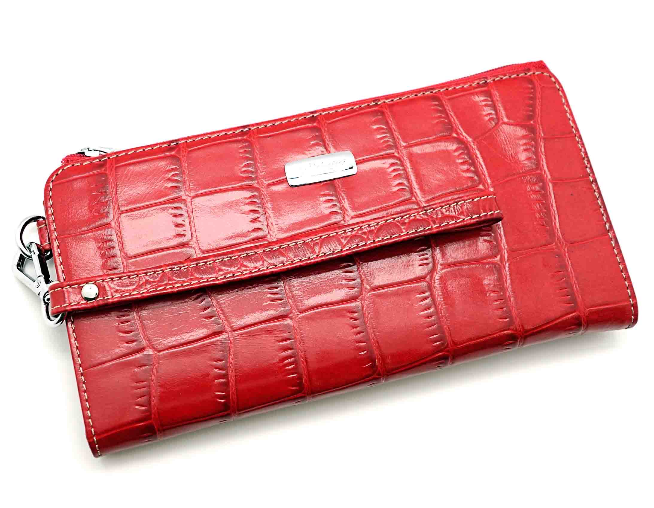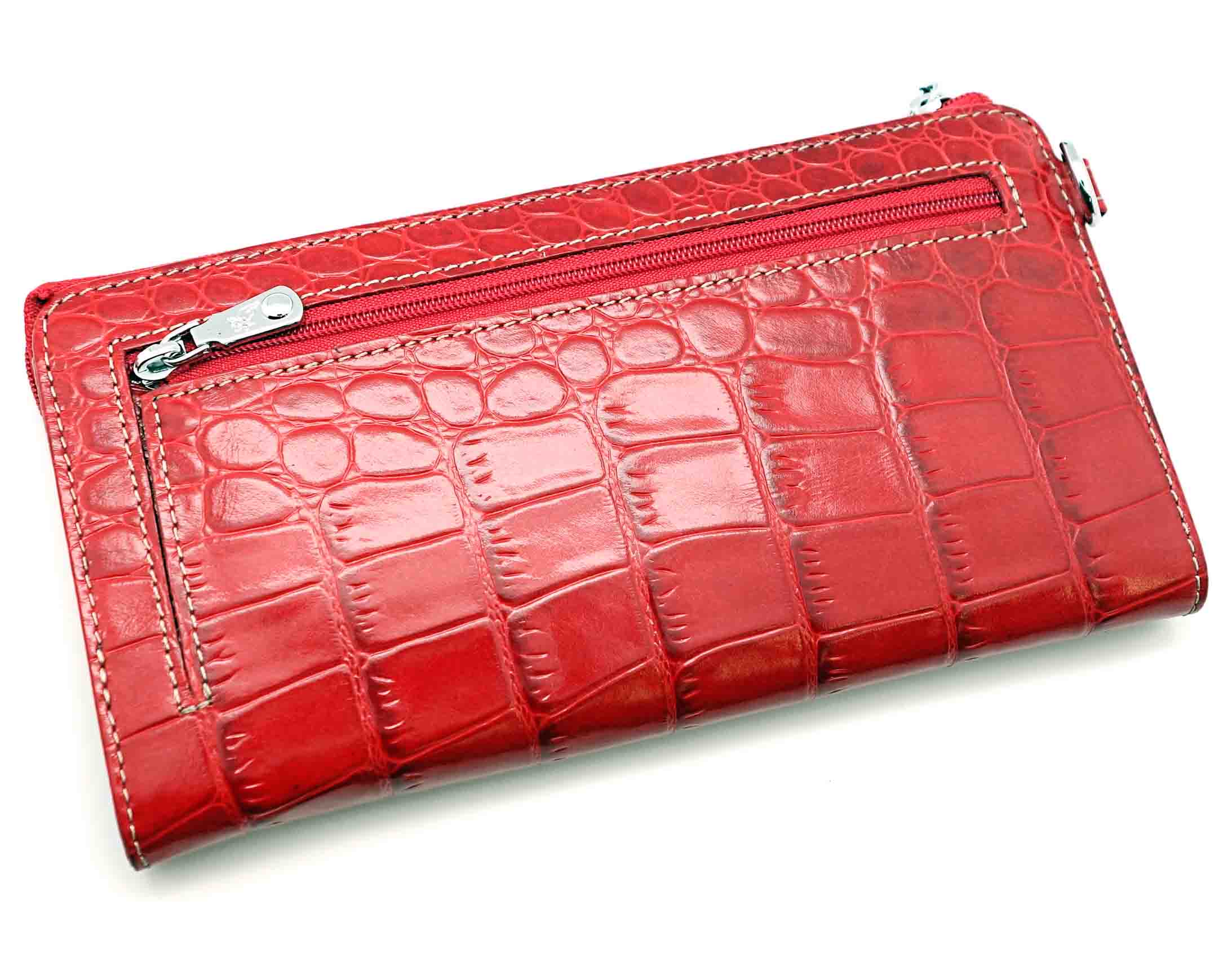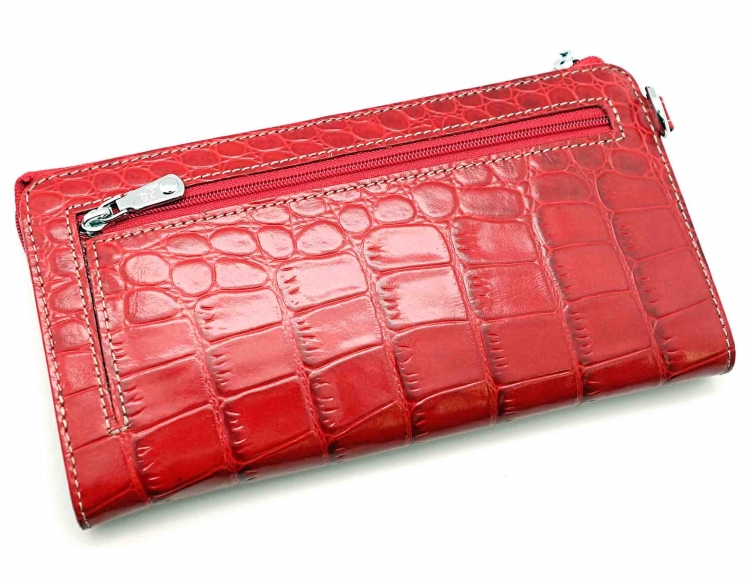 Размер 20 х 10 см.. Закрывается на молнию. Внутри - два отделения и два кармана для купюр, отделение для монет на молнии, 14 кармашков для пластиковых карт. Снаружи: на оборотной стороне карман на молнии, в левой части металлическое полукольцо для крепления кожаного ремешка с карабином.