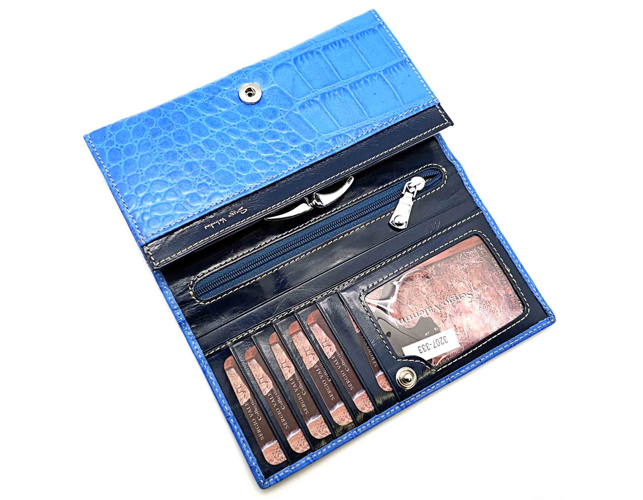 Размер 17 х 9,5 см. Закрывается на кнопку. Внутри - два отделения и два кармана для купюр, два отделения для монет под рамочным замком, карман на молнии, пять кармашков для пластиковых карт, два продольных кармана на створке. Снаружи, на оборотной стороне - открытый карман.
