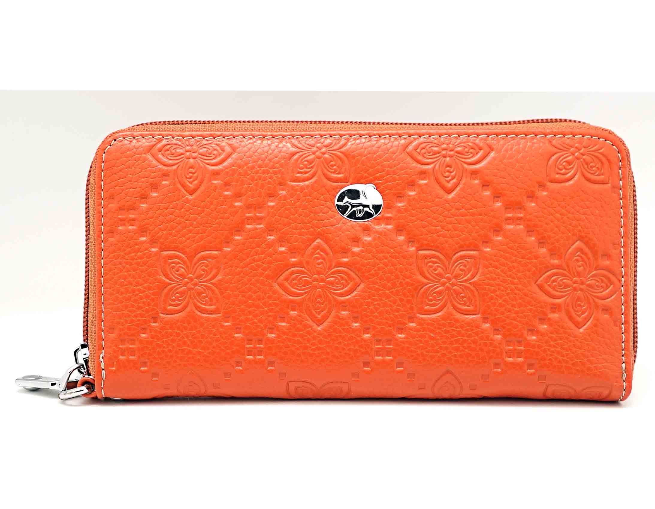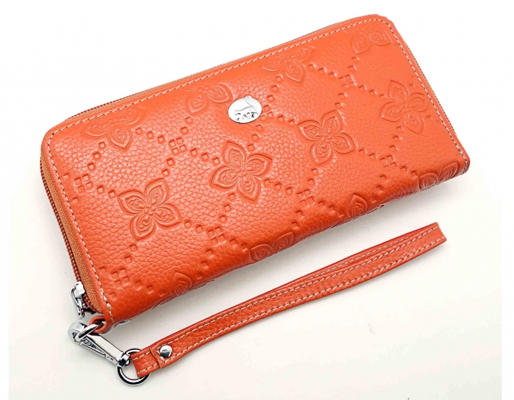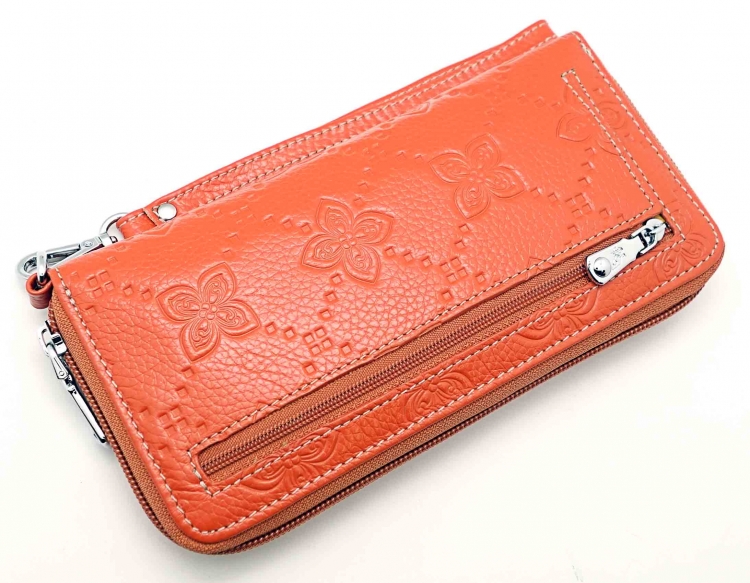 Размер 19 х 9,5 см.. Закрывается на молнию. Внутри - три отделения и два кармана для купюр, отделение для монет на молнии, 15 кармашков для пластиковых карт. Снаружи: на оборотной стороне карман на молнии, в нижней левой части металлическое полукольцо для крепления кожаного ремешка с карабином.