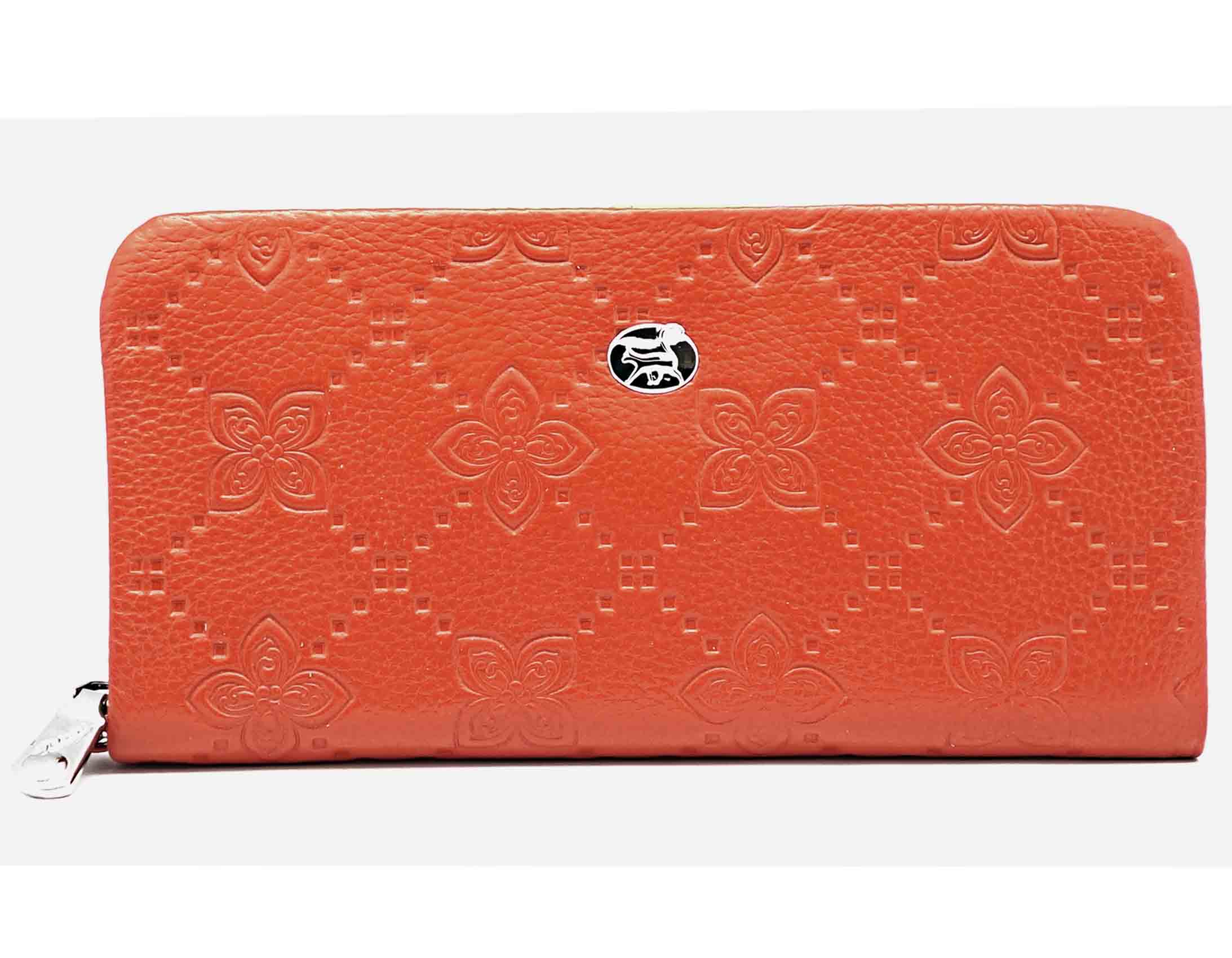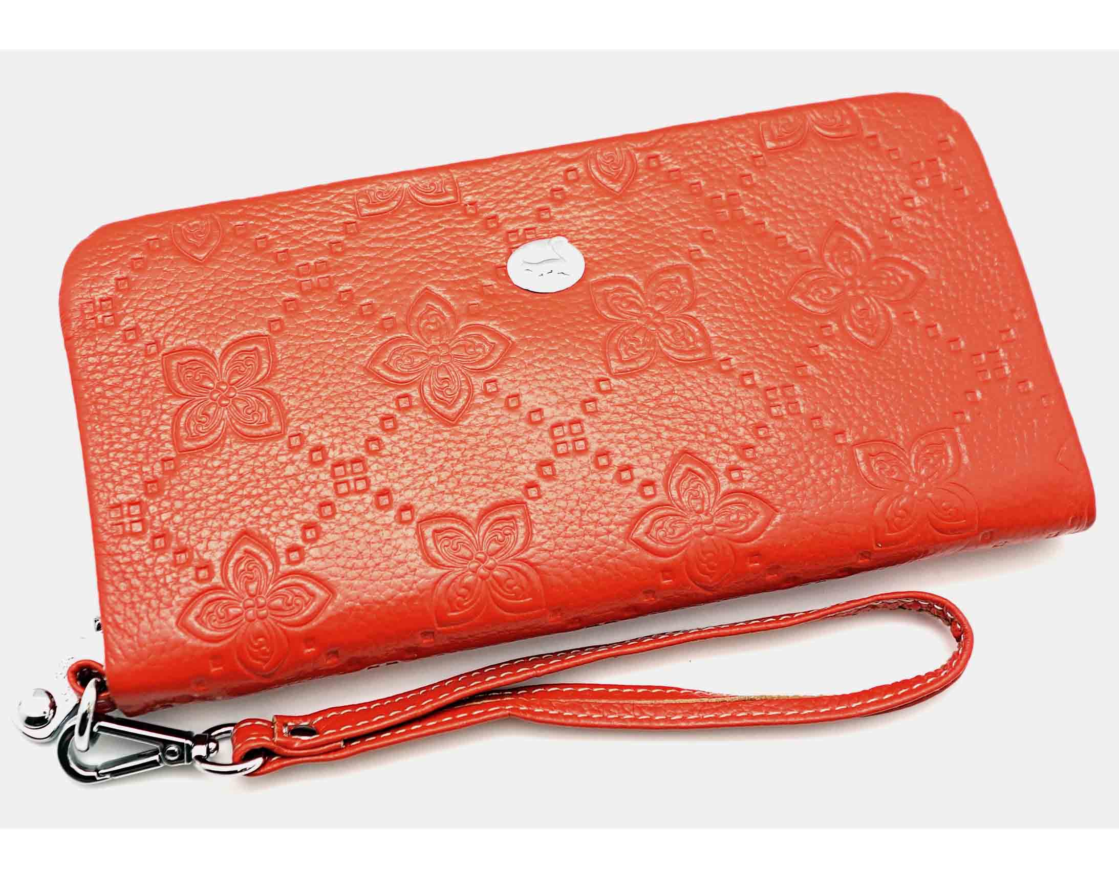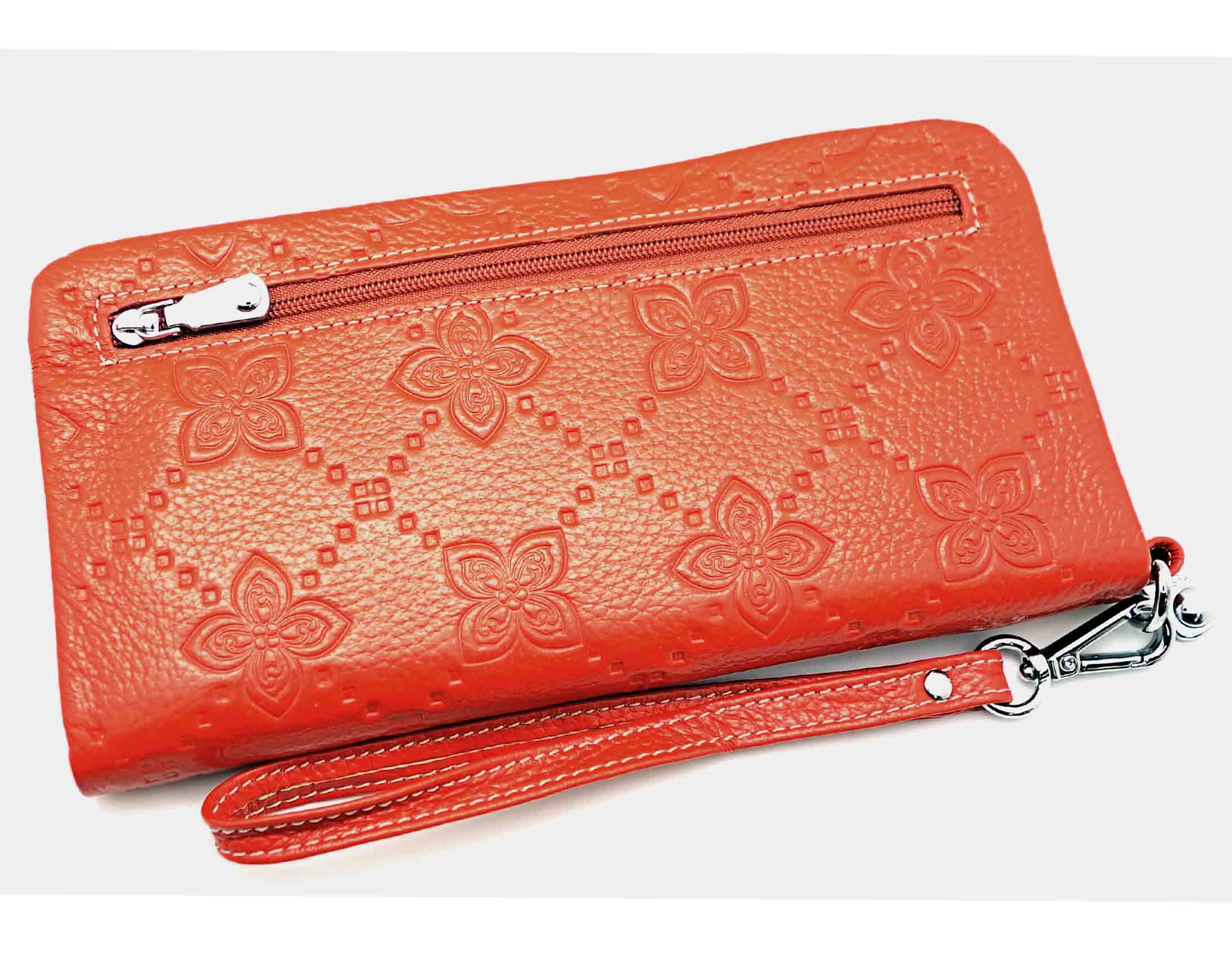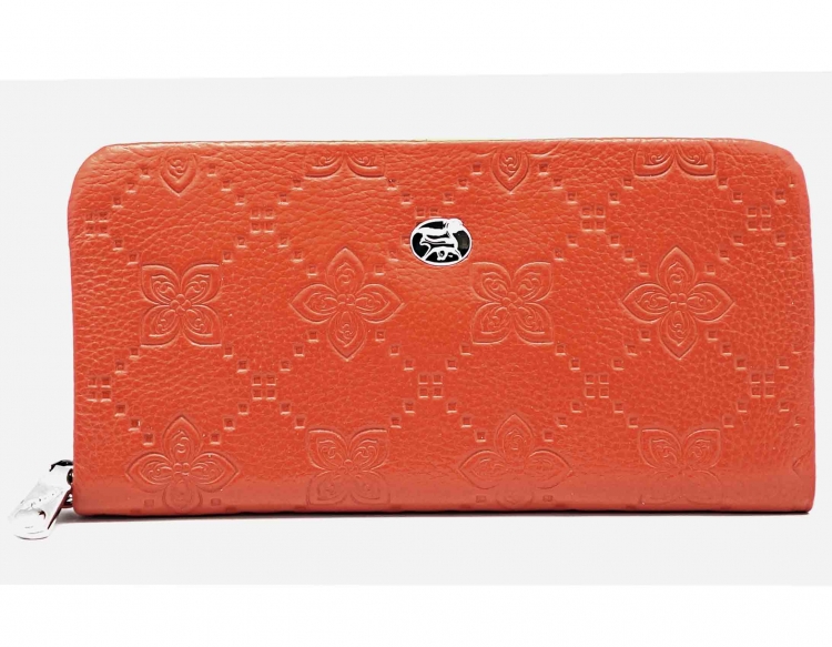 Размер 20 х 10,5 см. Закрывается на молнию. Внутри: два отделения и карман для купюр, три кармана на молнии, 11 кармашков для пластиковых карт. Снаружи, на тыльной стороне, отделение для монет на молнии. К портмоне пристёгивается кожаный ремешок.