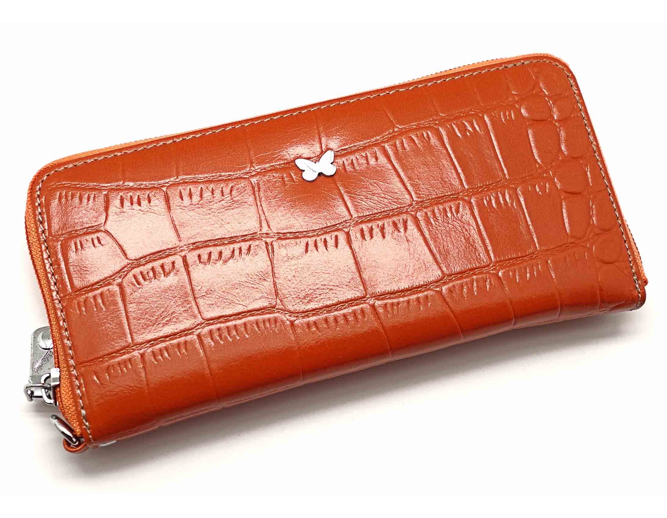 Размер 19 х 9,5 см.. Закрывается на молнию. Внутри - три отделения и два кармана для купюр, отделение для монет на молнии, 15 кармашков для пластиковых карт. Снаружи: на оборотной стороне карман на молнии, в нижней левой части металлическое полукольцо для крепления кожаного ремешка с карабином.