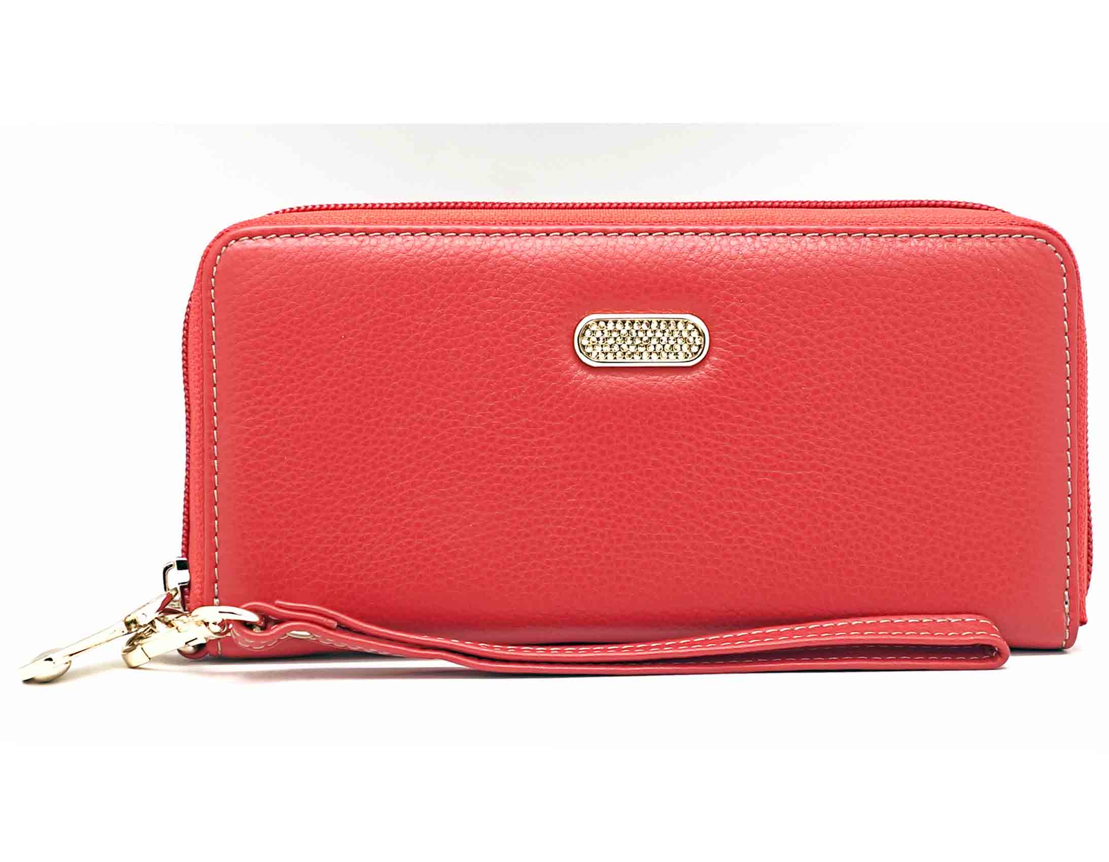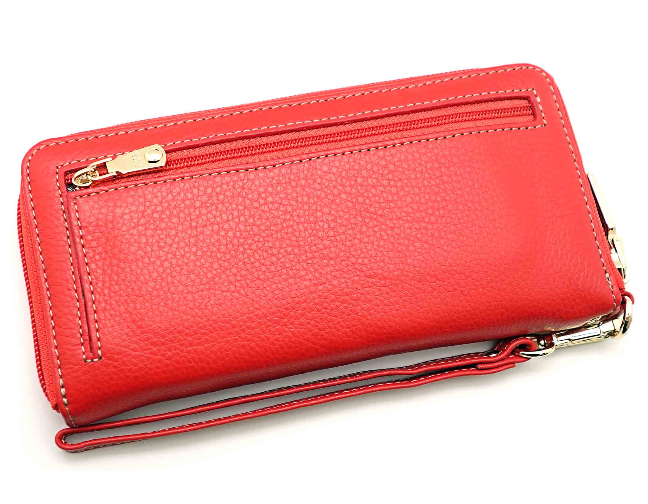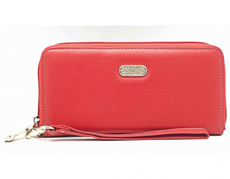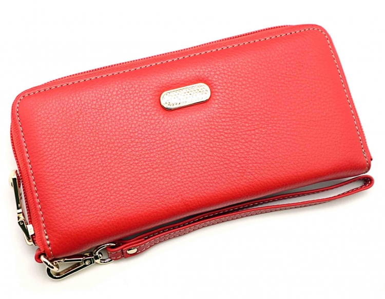 Размер 19 х 9,5 см.. Закрывается на молнию. Внутри - три отделения и два кармана для купюр, отделение для монет на молнии, 15 кармашков для пластиковых карт. Снаружи: на оборотной стороне карман на молнии, в нижней левой части металлическое полукольцо для крепления кожаного ремешка с карабином.
