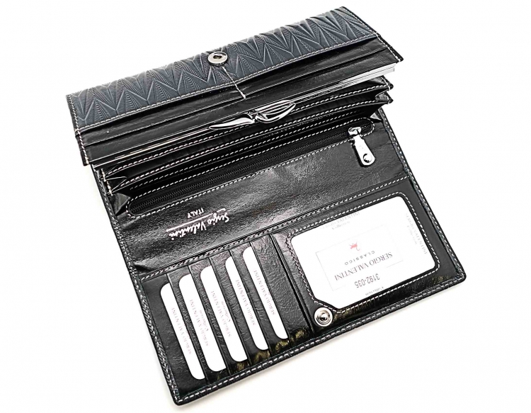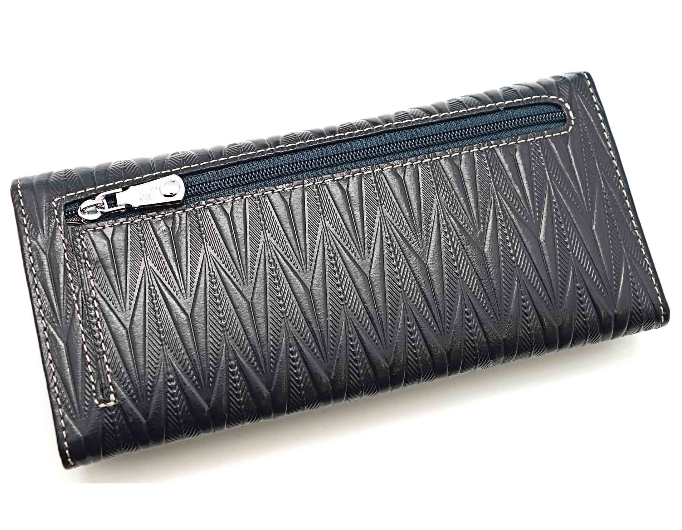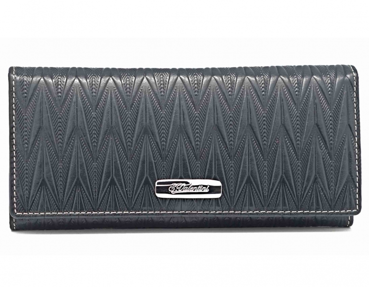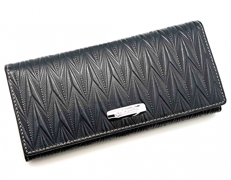 Изготовлено из высококачественной кожи тёмно-синего цвета. Размер 18,5 х 9.5 см.. Закрывается на кнопку. Внутри - три отделения и один карман для купюр, два отделения для монет под рамочным замком, карман на молнии, 12 кармашков для пластиковых карт, один продольный карман на створке, прозрачное окошко для фотографии. Снаружи, на тыльной стороне, карман на молнии.