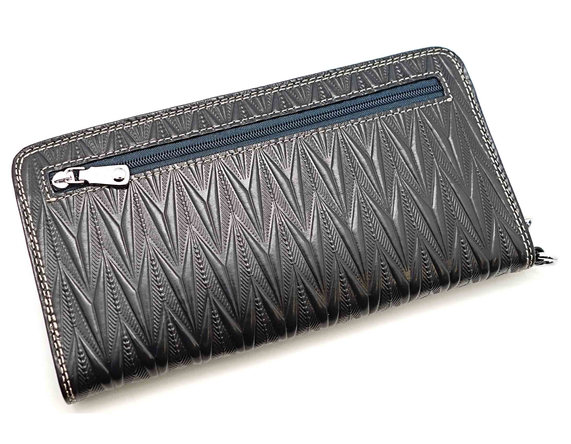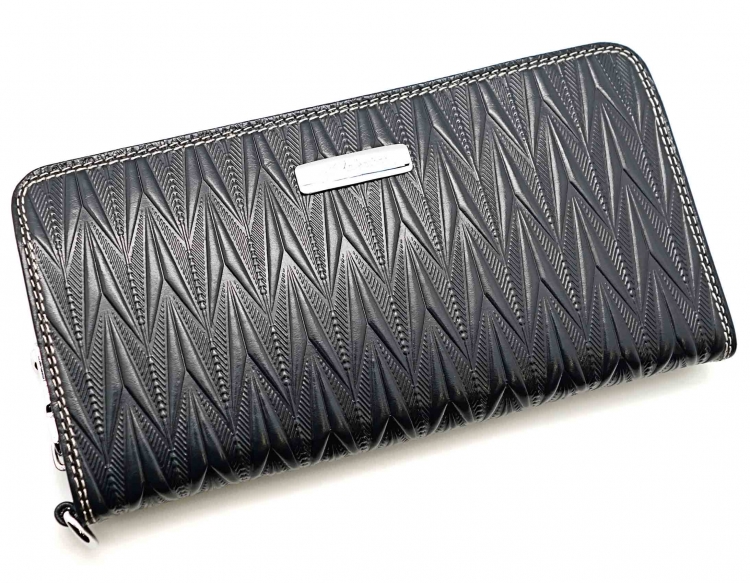 Изготовлено из высококачественной кожи тёмно-синего цвета. Размер 20 х 10,5 см. Закрывается на молнию. Внутри: два отделения и два кармана для купюр, один карман на молнии, 11 кармашков для пластиковых карт. Снаружи, на тыльной стороне, отделение для монет на молнии. К портмоне пристёгивается кожаный ремешок.