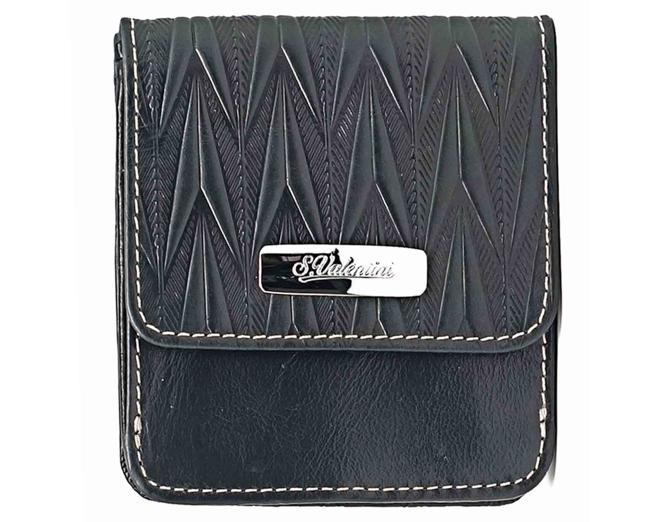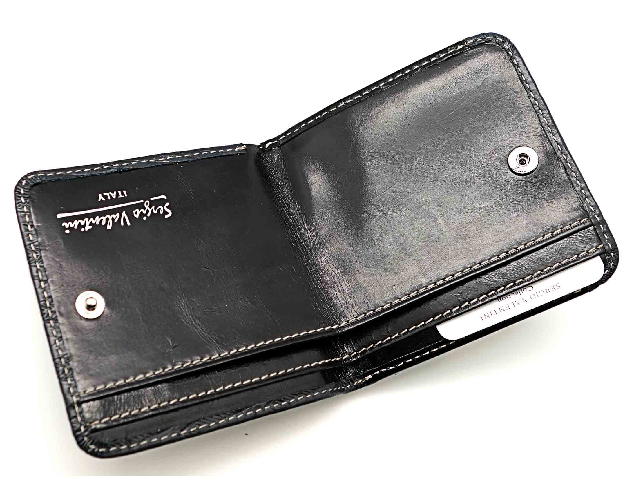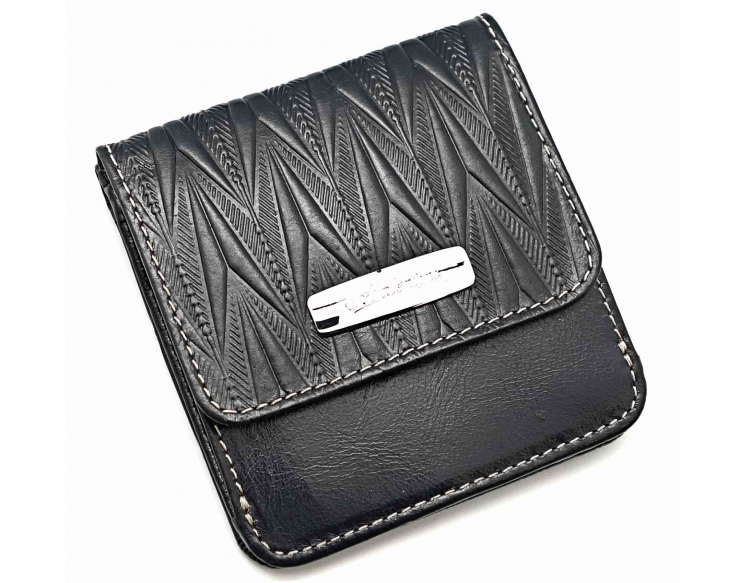 Изготовлено из высококачественной кожи тёмно-синего цвета. Изготовлено из высококачественной кожи тёмно-синего цвета. Размер 9,5 х 9 см. Закрывается на кнопку. Имеет два отделения для купюр и кармашек для пластиковой карты. Снаружи отделение для монет, закрывающееся клапаном с кнопкой.